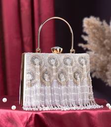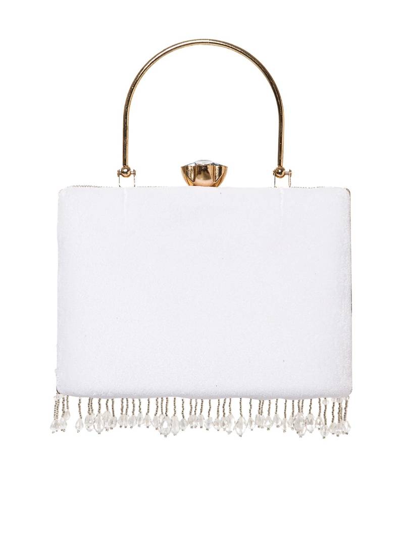 This Anekaant Clutch From The Crystal Cascade Collection Is A Timeless Statement Piece. Designed In White With Silver And Crystal Beadwork, It Is Finished With A Gold Handle And Crystal Clasp. Crafted On A Velvet Base, It Features Concentric Teardrop Bead Embroidery Enhanced With Cascading Fringe For Graceful Movement. It Includes A Spacious Compartment With A Secure Click Closure And Comes With A Detachable Shoulder Strap And Gold Handle For Versatile Styling. Dimensions (L X H X W): 18 X 13 X 7 Cm
