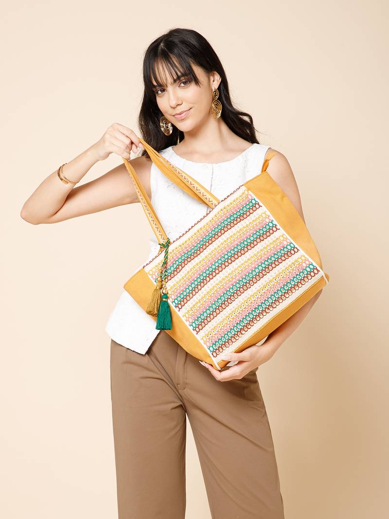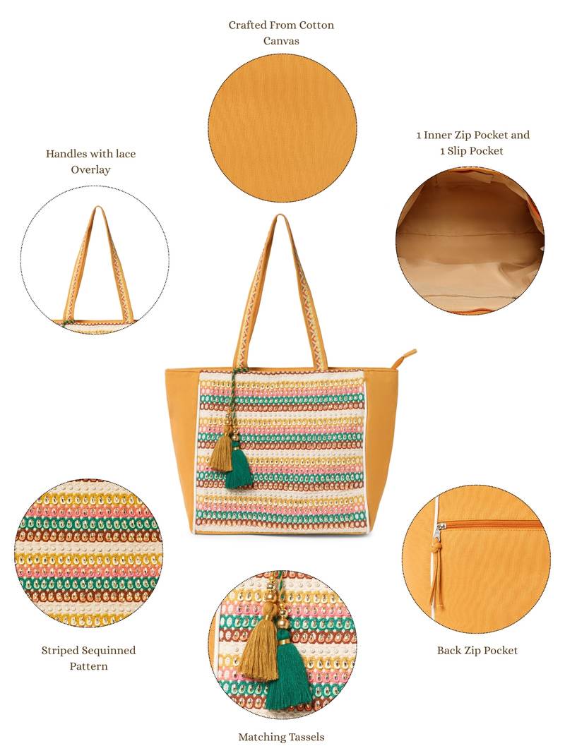 | Product Name | Folklore Edit Mustard Yellow & Multi Cotton Striped Sequined Tote Bag | |