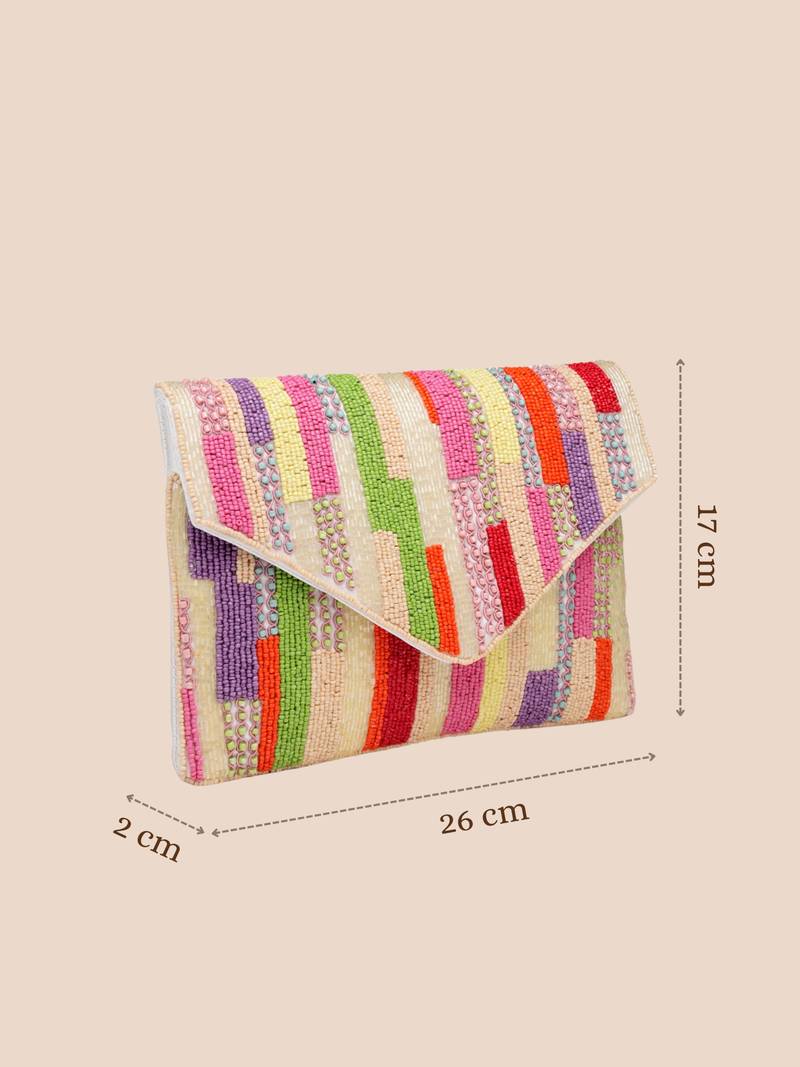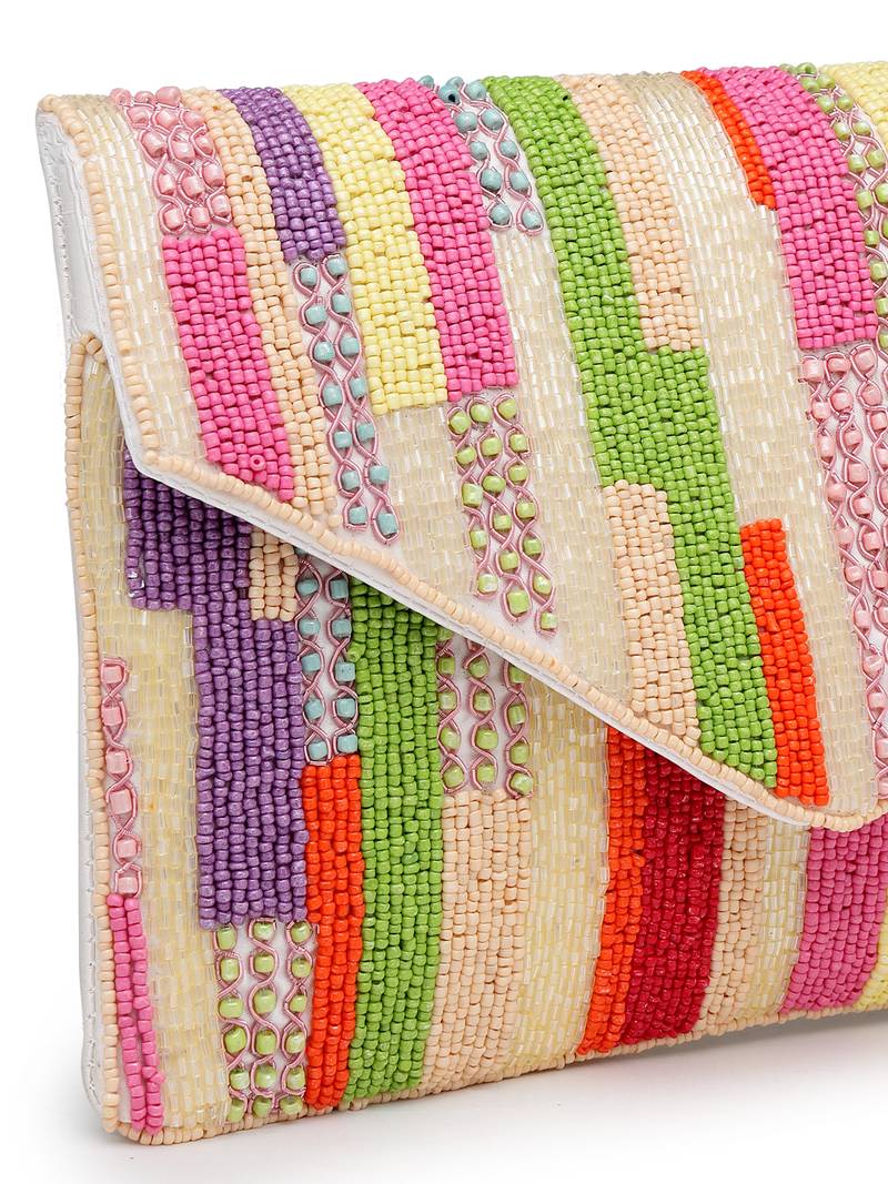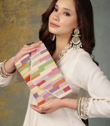 This Anekaant Sling Bag From The Mod Stitch Collection Features A Single Main Compartment Secured With A Magnetic Button Closure For Easy Access. Designed In Elegant Off White And Beige Tones With Subtle Multicolour Accents, It Offers A Refined Festive Appeal. Crafted From Smooth Satin Fabric And Finished With A Coordinated Satin Lining, The Bag Is Enhanced With Intricate Bead And Nalki Detailing For A Rich, Handcrafted Finish. It Includes One Inner Slip Pocket For Essentials And Comes With A Detachable Chain Strap, Allowing It To Be Styled As A Clutch Or Worn Crossbody. Dimensions (L × H × W): 26 × 17 × 2 Cm.