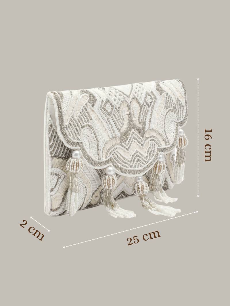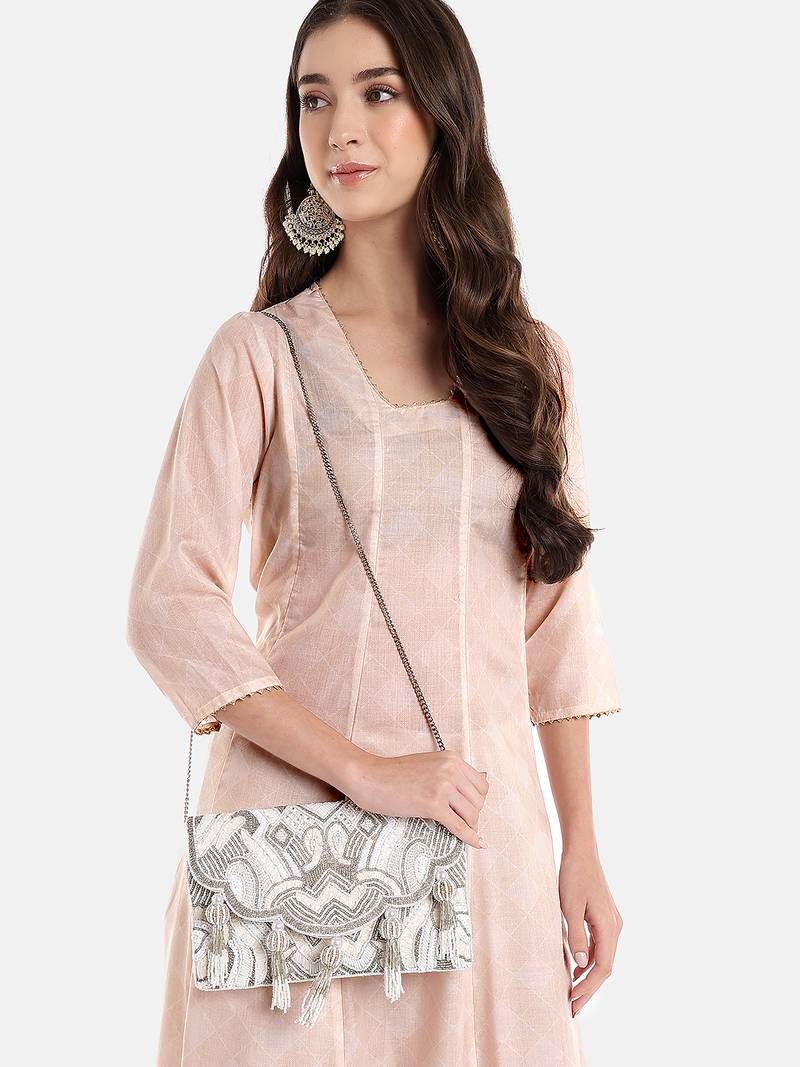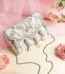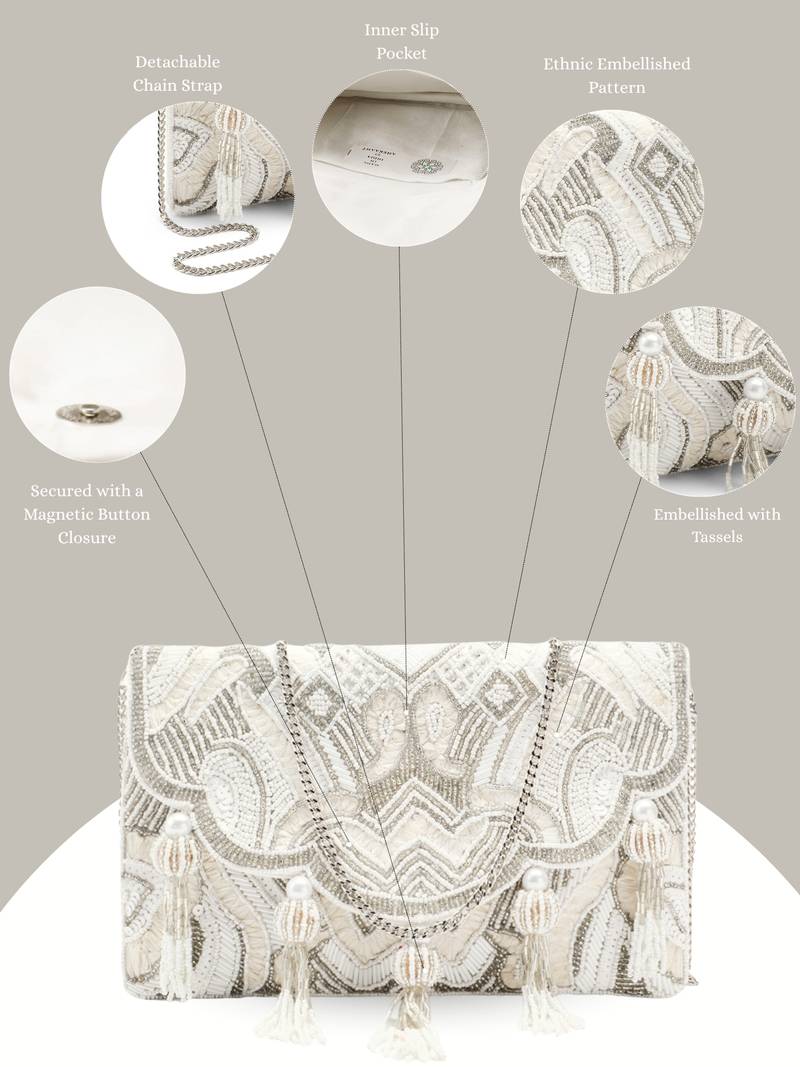 Product Name | Tassel Tales Ivory & Antique Silver Ethnic Embellished Satin Sling Bag | |