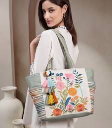 | Product Description | This Anekaant Tote Bag From The Thread Bloom Collection Is Crafted From Cotton Canvas And Acrylic Jacquard In Sage Green With A Cream Panel, Highlighted By Floral Embroidery In Pink, Orange, Blue, And Green. Designed With A Roomy Main Compartment Secured By A Zip Closure, The Front Showcases Bold Blooms With Leafy Stems, While Striped Woven Sides In Earthy Hues Add Artisanal Character. The Interior Includes An Inner Zip Pocket At The Back For Valuables, Complemented By An External Back Zip Pocket For Quick Access. Dual Side Bottle Holders, Lace Trimmed Shoulder Handles, And A Matching Tassel Accent Complete The Design, Making This Tote A Versatile Choice For Everyday Use And Festive Occasions. Dimensions (L X H X W): 33 X 30 X 15 Cm. |