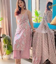 Elevate Your Ethnic Wardrobe With This Stunning Pink Cotton Salwar Suit Set Featuring An Exquisite Paisley Block Print Design. The Sleeveless Kurta Showcases A Beautiful Blend Of Traditional Paisley Motifs And Floral Patterns In A Delightful Pink And White Colour Combination. The Comfortable Sleeveless Silhouette Is Perfect For Warm Weather, While The Cotton Fabric Ensures Breathability And Comfort Throughout The Day. The Set Includes Matching Palazzo Style Bottoms Adorned With A Complementary Block Print Pattern And A Coordinating Dupatta That Completes The Ensemble. The Traditional Block Printing Technique Gives Each Piece A Unique Artisanal Touch. Perfect For Festive Occasions, Social Gatherings, Or Casual Outings, This Versatile Three Piece Set Combines Classic Design Elements With Contemporary Styling. The Ensemble Offers Both Style And Comfort, Making It A Must Have Addition To Your Traditional Wear Collection.Design Elements: Beautiful Pink Cotton Suit Set Featuring Elegant Paisley And Block Print Patterns In A Sleeveless Kurta Design With Coordinated Dupatta. Traditional Style: Three Piece Ensemble Includes A Sleeveless Kurta, Matching Bottoms, And A Complementary Dupatta For Complete Ethnic Wear. Fabric Quality: Crafted From Premium Cotton Material Ensuring Comfort And Breathability, Perfect For Daily Wear And Casual Occasions. Print Pattern: Distinctive Combination Of Paisley Motifs On The Kurta With Floral Block Prints On The Bottoms Creates A Harmonious Look. Versatile Wear: Knee Length Kurta With Comfortable Pant Makes It Suitable For Various Occasions From Casual Outings To Semi Formal Events