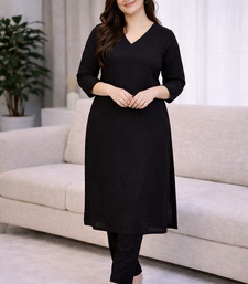 Solid straight brown kurta set for women with pant 3::4 sleeve, v neck designer kurta with pant set