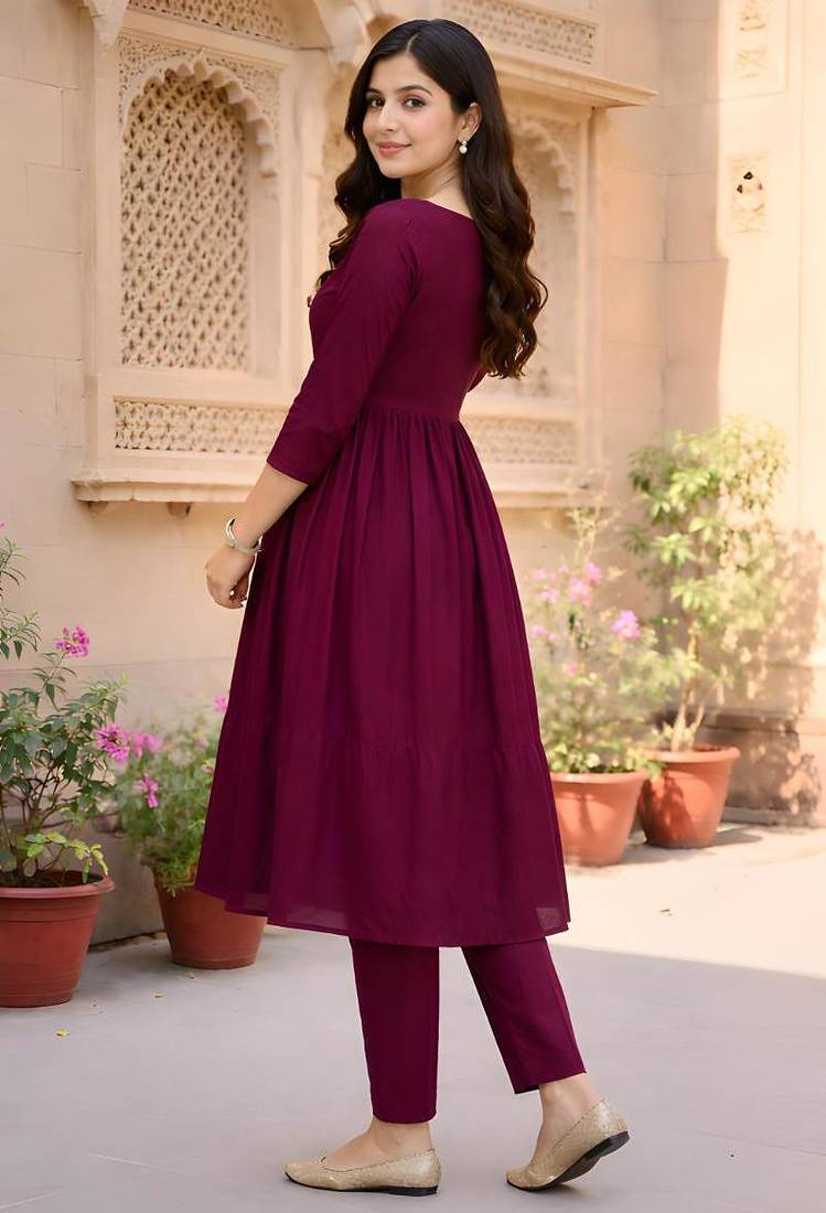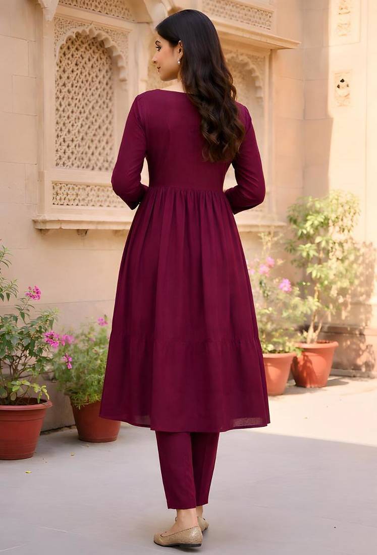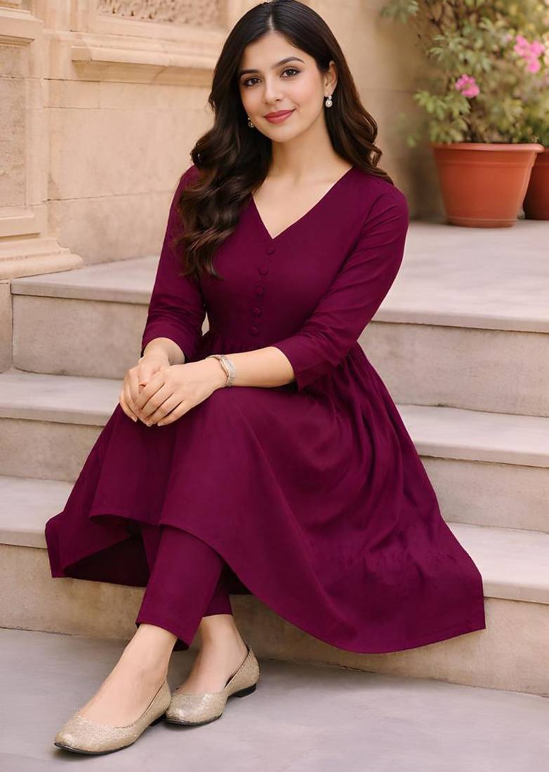 Women's Long Flared V Neck With Button Details Anarkali Shape Empire Waist,Kurta Pant Set