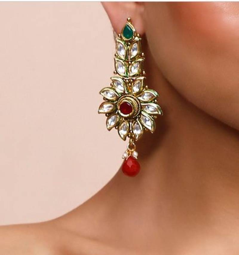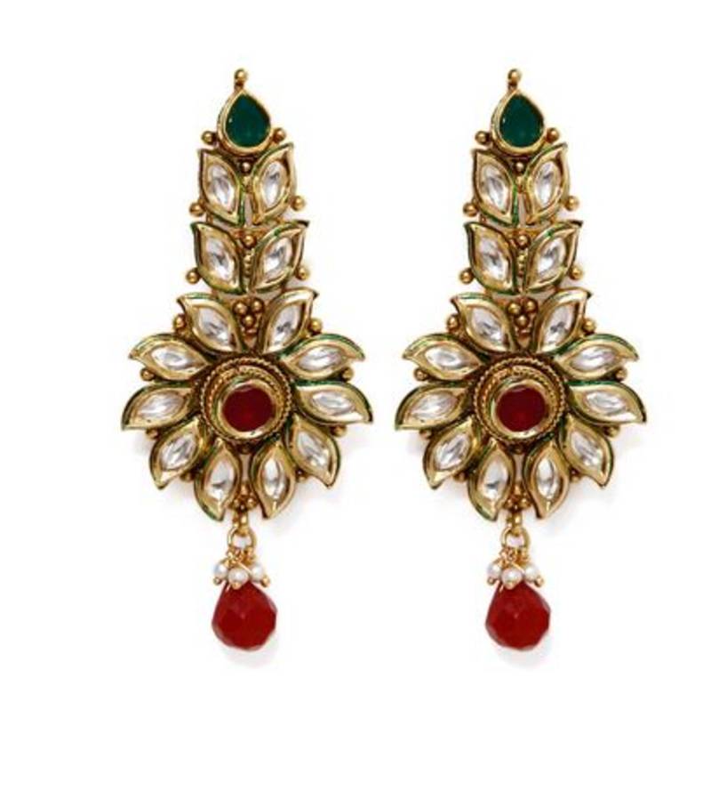 | Product Description | This Is A Pair Of Golden Finished Alloy Metal Floral Earrings Embellished With Faux Kundans With A Red Stone Drop. The Earrings Feature A Push Back Closure. |