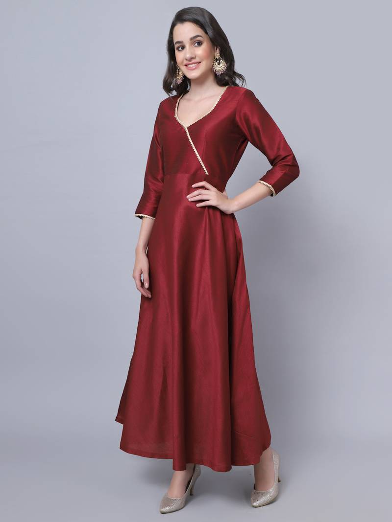 | Product Description | Richness Of Maroon Combined With Softness Of Silk With Gota Detailing. Prepare To Get Overwhelmed With A Swirl Of Compliments By Dressing Yourself In Our Magical Maroon Silk Floorlength. The Floor Length Silk Kurti Comes With A Gota Embellished "V" Neck Line, Quarter Sleeves, And A Lot Of Flare. |