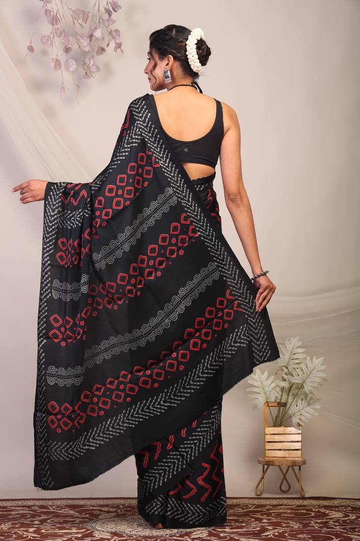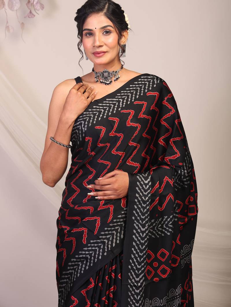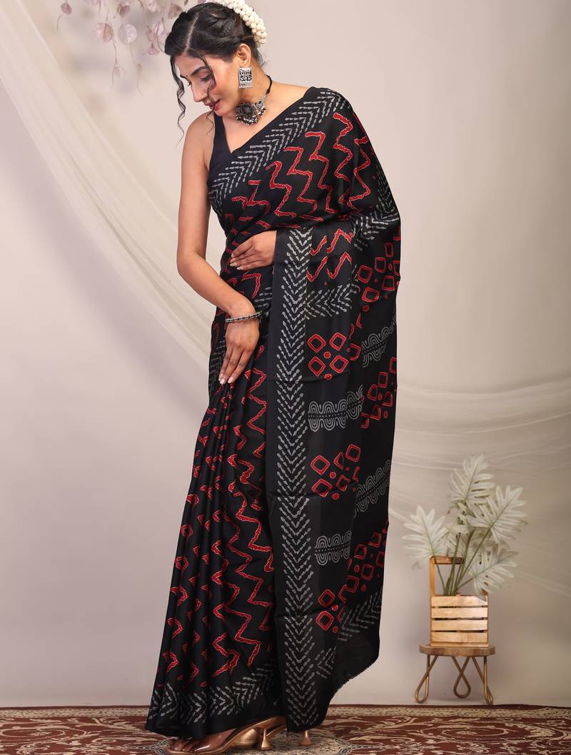 | Product Description | Let Your Ethnic Style Speak With Our Black & Red Bhagalpuri Modal Silk Saree — A Striking Blend Of Tradition And Modern Sophistication. This Beauty Showcases The Iconic Bhagalpuri Weave Known For Its Finesse, Elevated With Intricate Hand Block Printing And Chevron Motifs That Breathe Life Into Every Thread. |