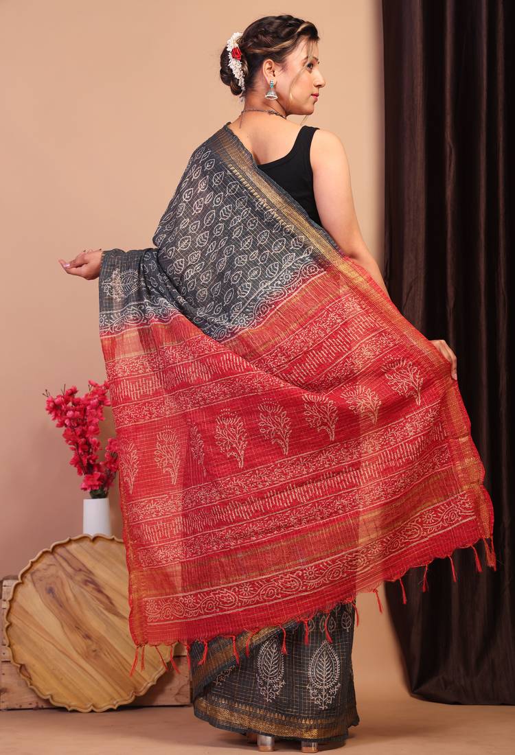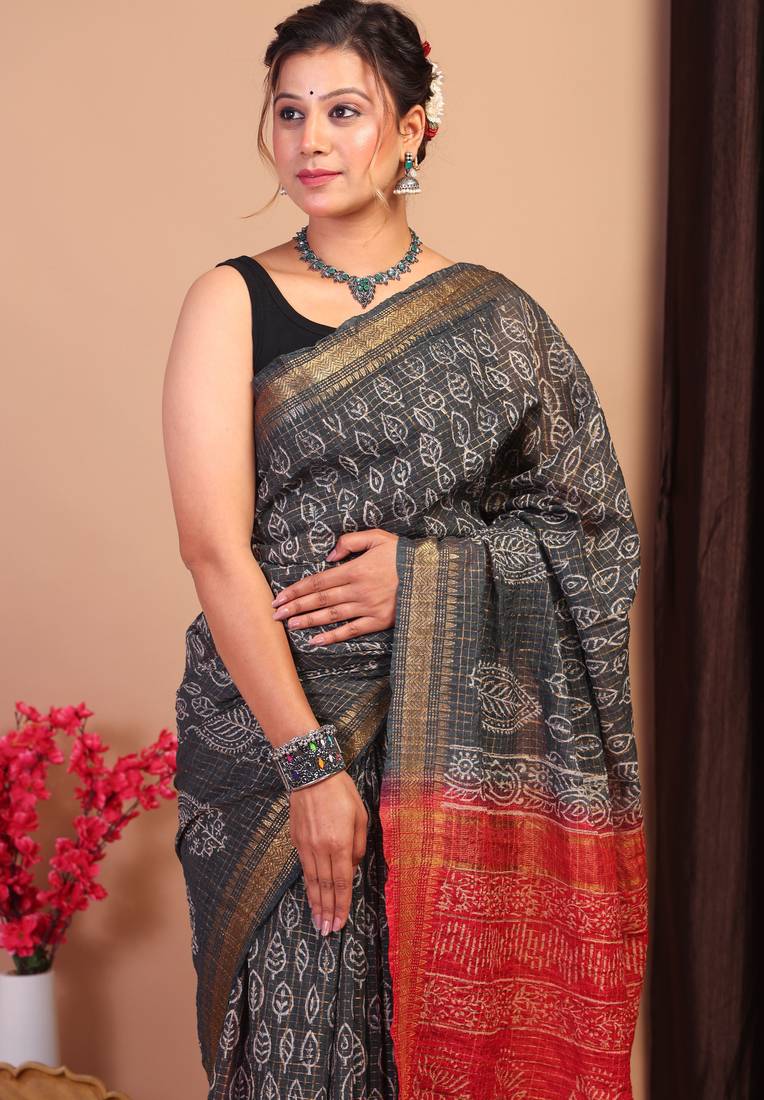 | Product Description | Make A Statement With This Exquisite Black/Red Bhagalpuri Cotton Silk Saree, A Perfect Blend Of Traditional Elegance And Contemporary Charm. Adorned With A Classic Handblock Print Of Checks And Floral Motifs, This Saree Showcases Intricate Patterns That Exude Timeless Beauty.The Saree Features A Thick Dabu Zari Golden Border That Adds A Regal Touch, While Embellishments, Frill Detailing, And Zari Work Enhance Its Luxurious Appeal. |