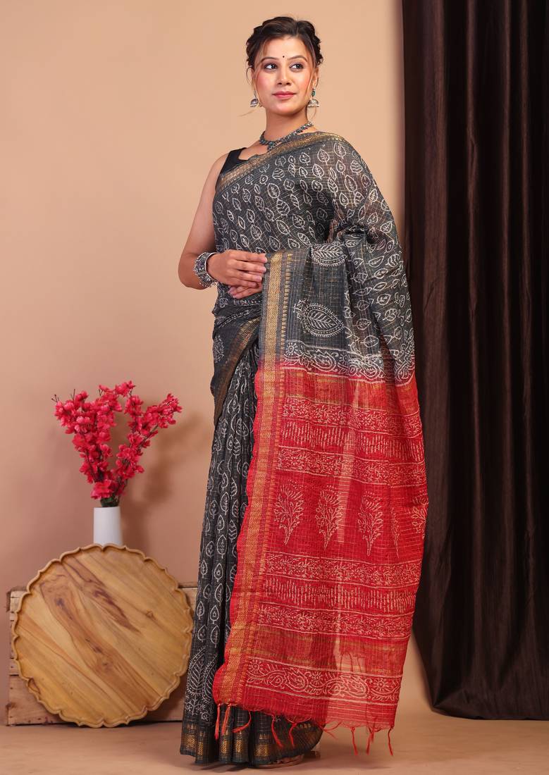 | Product Name | Black & Red Zari Work, Dabu Embroidery Cotton Silk Blend Bhagalpuri Ethnic Saree With Unstitched Blouse | |