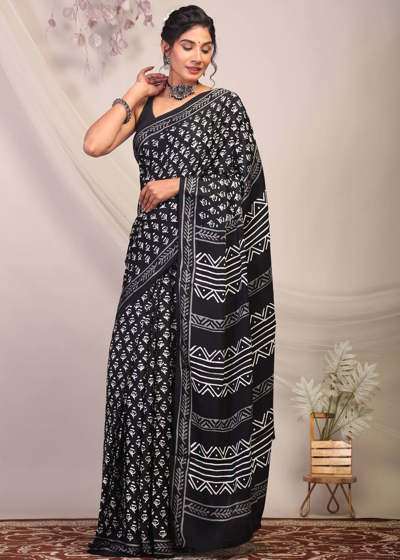 Black & white embellished modal silk blend bhagalpuri ethnic saree with unstitched blouse