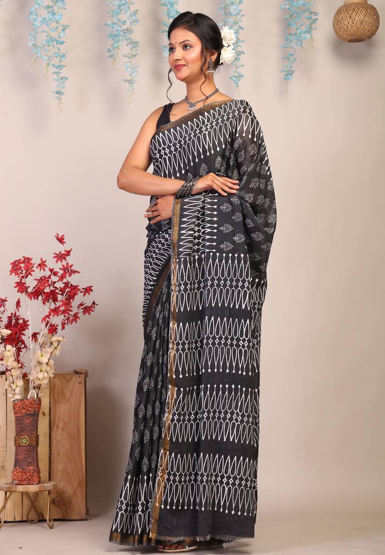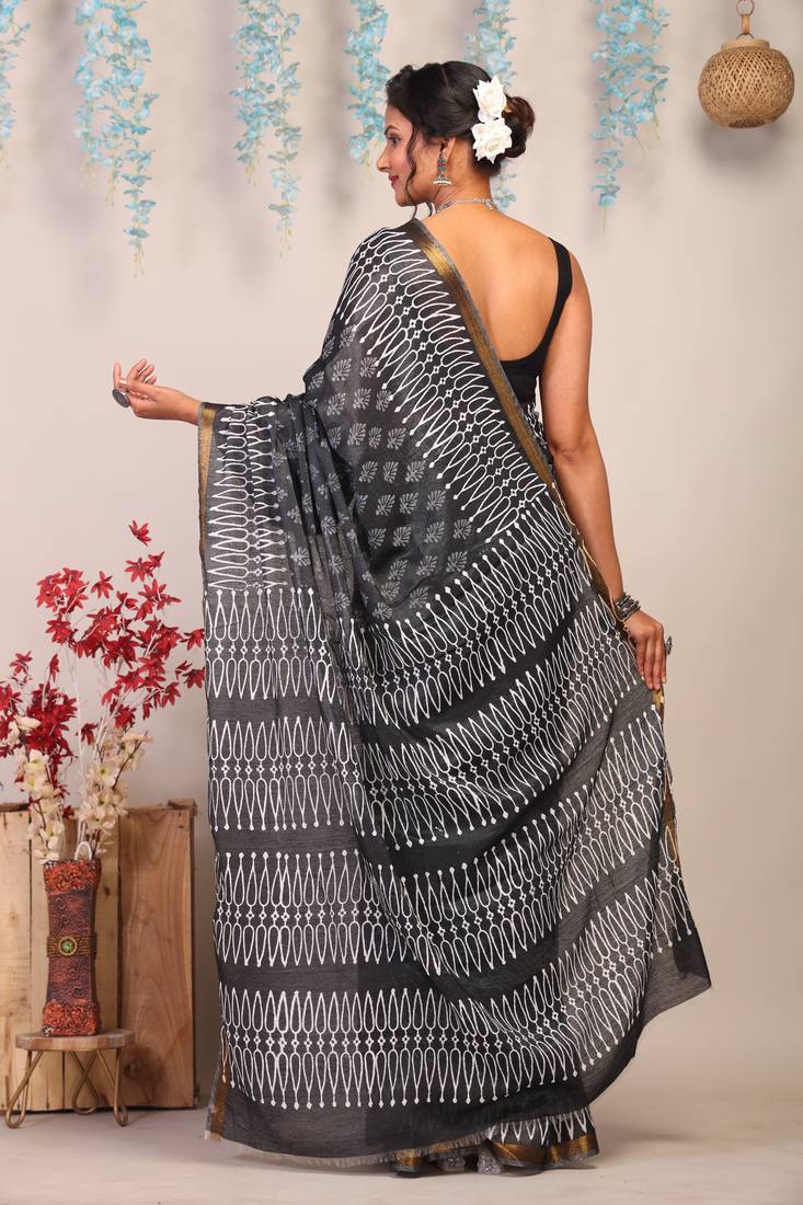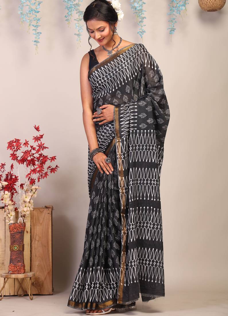 | Product Description | Get Ready To Turn Heads With Our Black/White Bhagalpuri Cotton Silk Ethnic Saree. This Stunning Saree Is Made From High Quality Cotton Silk Fabric And Features Intricate Hand Block Floral Designs. The Bhagalpuri Saree's Richness And Lustrous Texture Adds A Touch Of Elegance, Making It Perfect For Weddings, Festive Occasions, Or Any Special Event. The Saree Is Embellished With Frills, Zari Work, And A Beautiful Gold Zari Border, Giving It A Luxurious And Eye Catching Look. |