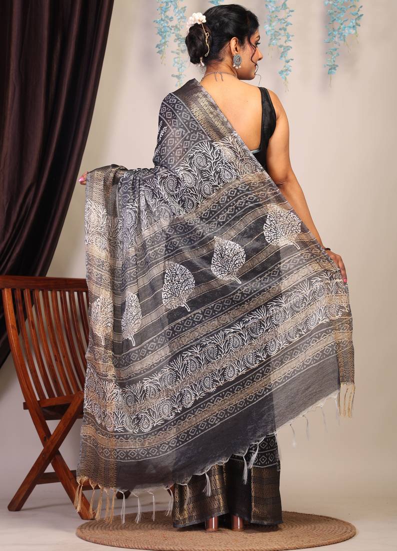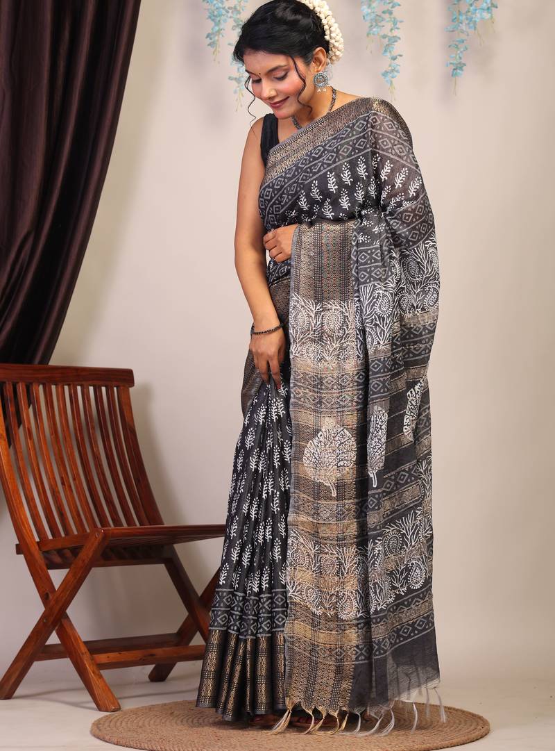 | Product Description | Turn Heads And Steal Hearts With Our Black & White Bhagalpuri Cotton Silk Saree With Golden Zari Border — Where Timeless Tradition Meets Contemporary Elegance. This Stunning Creation Blends The Rich Texture Of Bhagalpuri Weave With The Artisanal Beauty Of Hand Block Printing, Creating A Saree That’s As Unique As You Are.Crafted From High Quality Cotton Silk, The Saree Offers A Lightweight, Luxurious Drape That Feels As Good As It Looks. |