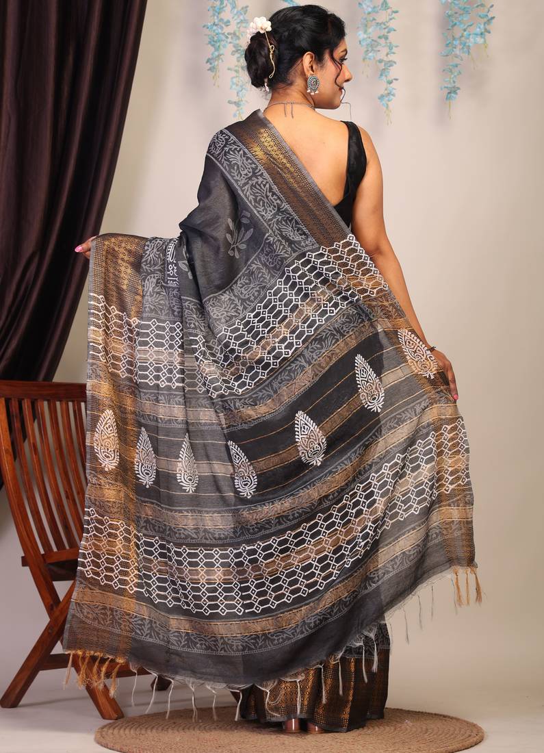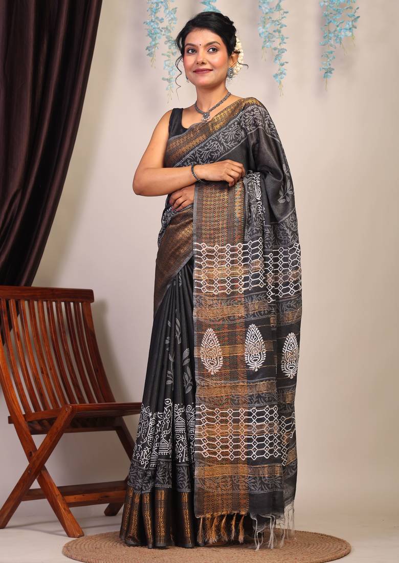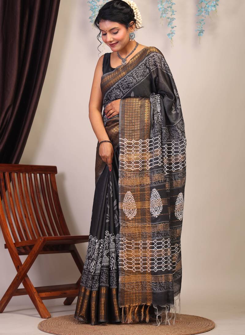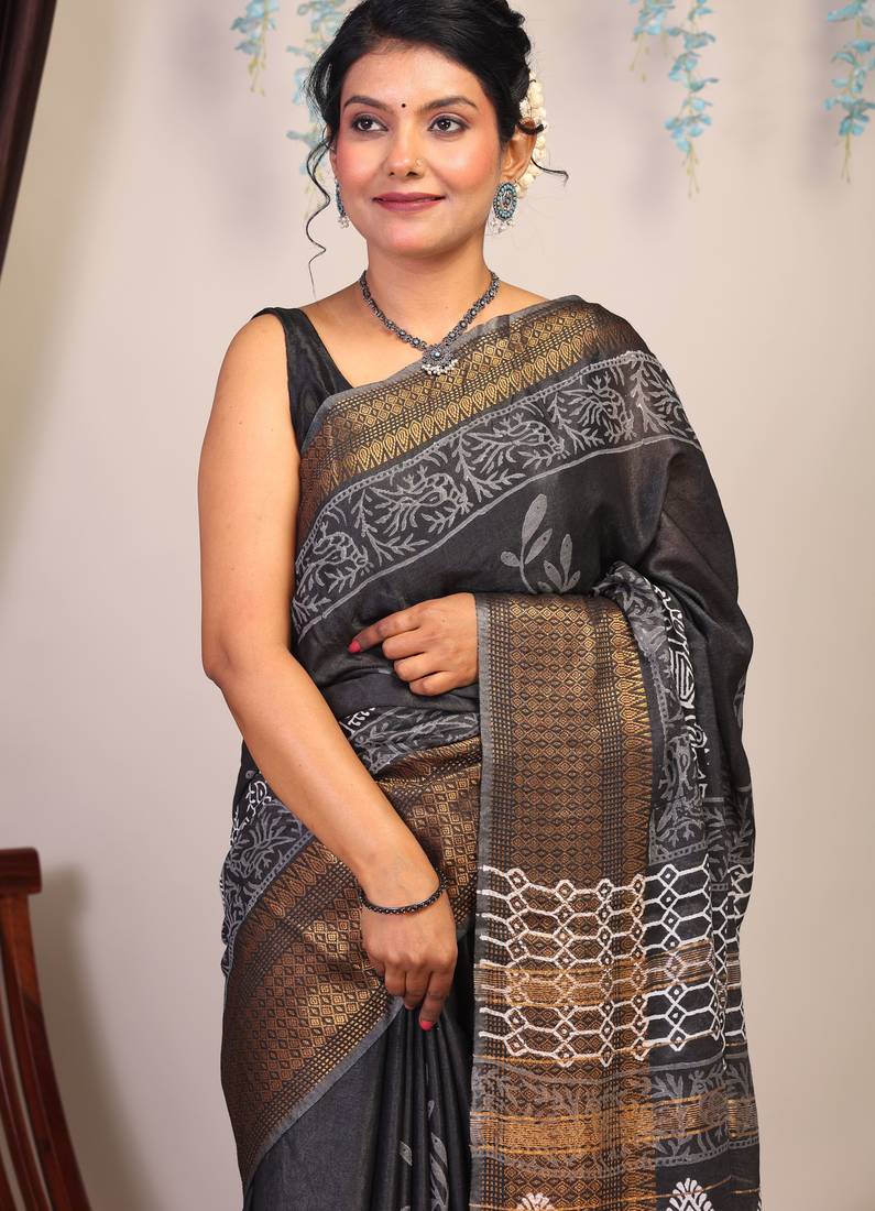 | Product Description | Looking To Make An Unforgettable Entrance? This Black & White Bhagalpuri Cotton Silk Saree Is Your Perfect Match. A Gorgeous Mix Of Traditional Craftsmanship And Contemporary Flair, It Features Stunning Floral/Paisley Hand Block Prints On Luxurious Cotton Silk—Bringing To Life The Rich Heritage Of Bhagalpur In Every Drape. The Black And White Palette Speaks Of Sophistication, While The Shimmering Gold Zari Ddabu Border Adds Just The Right Touch Of Celebration. |