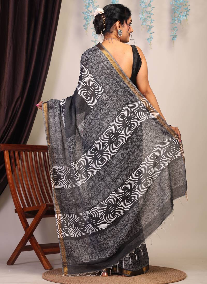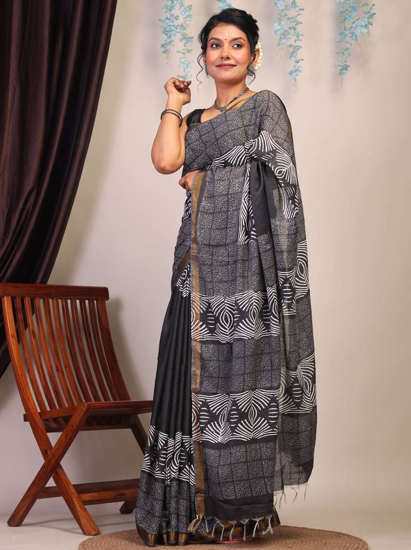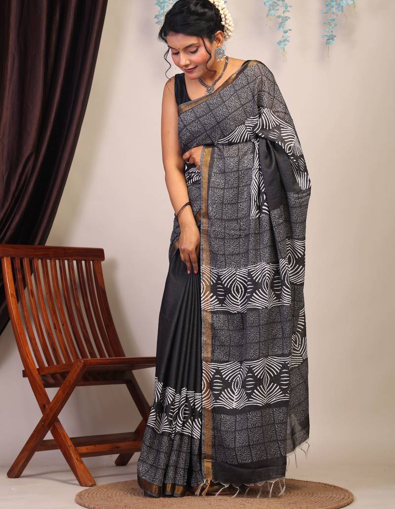 | Product Description | Bold, Elegant, And Undeniably Timeless — This Black & White Bhagalpuri Cotton Silk Saree With Golden Border Is Designed For The Woman Who Embraces Heritage With Confidence. Featuring The Iconic Bhagalpuri Weave And Jaipur’s Signature Hand Block Artistry, It's A Masterpiece Of Culture And Craftsmanship Brought To Life. |