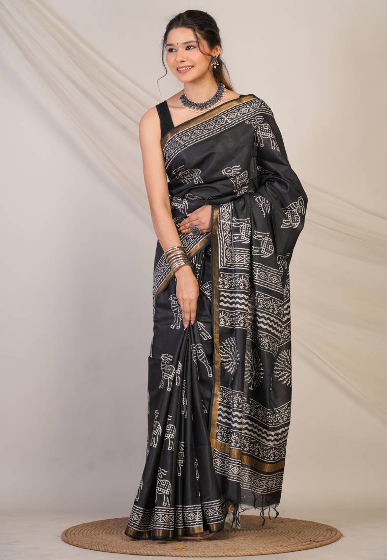 | Product Name | Black Zari Work Cotton Silk Blend Bhagalpuri Ethnic Saree With Unstitched Blouse | |