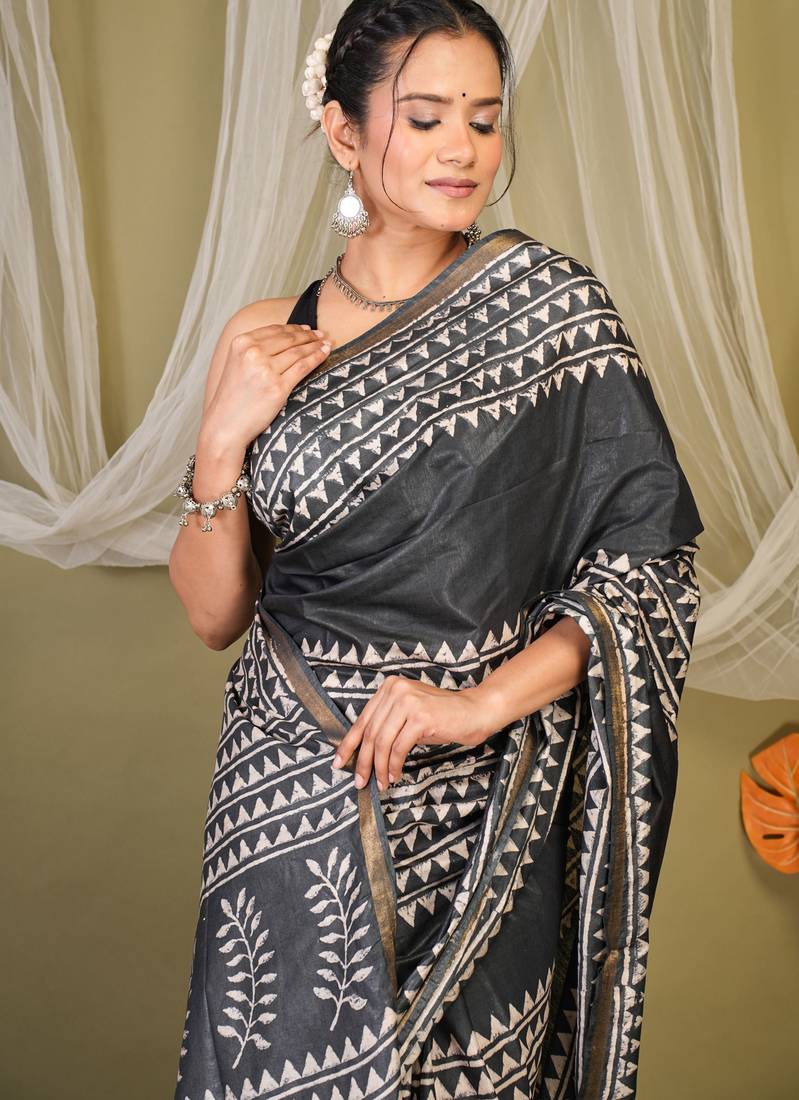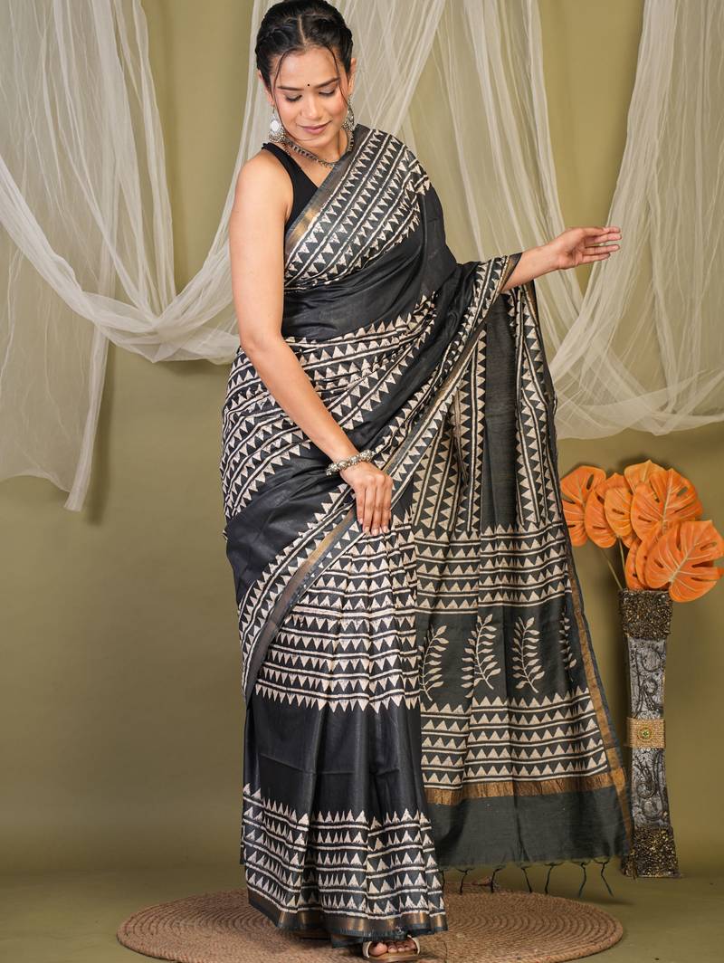 | Product Description | Wrap Yourself In The Rhythm Of Culture With Our Stunning Black Bhagalpuri Cotton Silk Saree—A Celebration Of Color, Craft, And Character. The Bold Black Canvas Sets The Stage For Geometric Hand Block Motifs, Telling Stories Rooted In Heritage And Handmade Precision.Soft And Breathable Cotton Silk Ensures Graceful Movement And All Day Comfort, While The Golden Zari Border Adds A Whisper Of Royalty. |