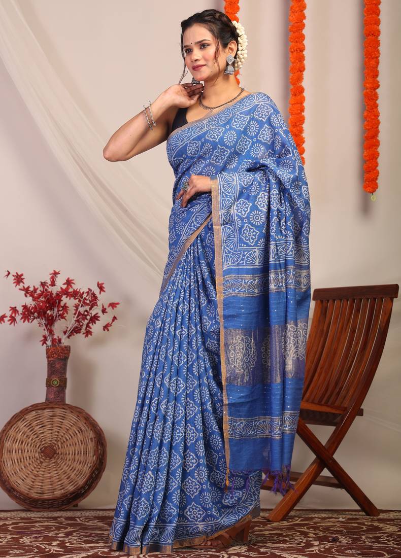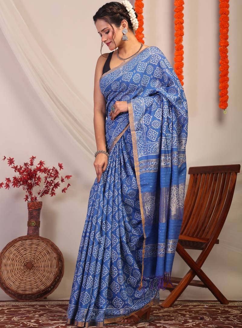 Step Into The Limelight With Our Blue Bhagalpuri Cotton Silk Saree — A Perfect Blend Of Traditional Artistry And Glamorous Detail. The Rich, Regal Blue Hue Is Brought To Life With Delicate Floral Hand Block Prints, Intricate Embroidery, Sparkling Sequins, And Graceful Frills. Framed By A Gleaming Golden Zari Border, This Saree Adds Just The Right Amount Of Shimmer To Your Festive Look.