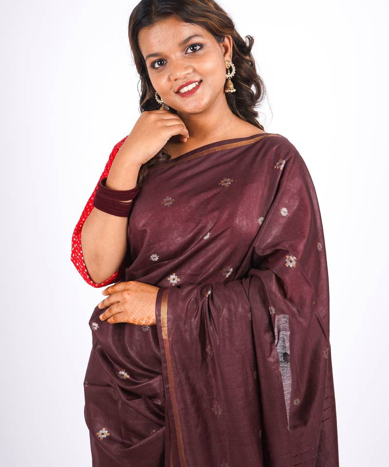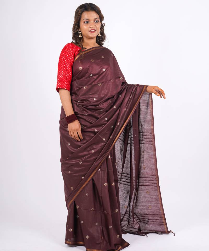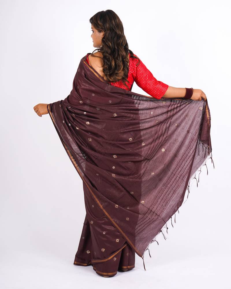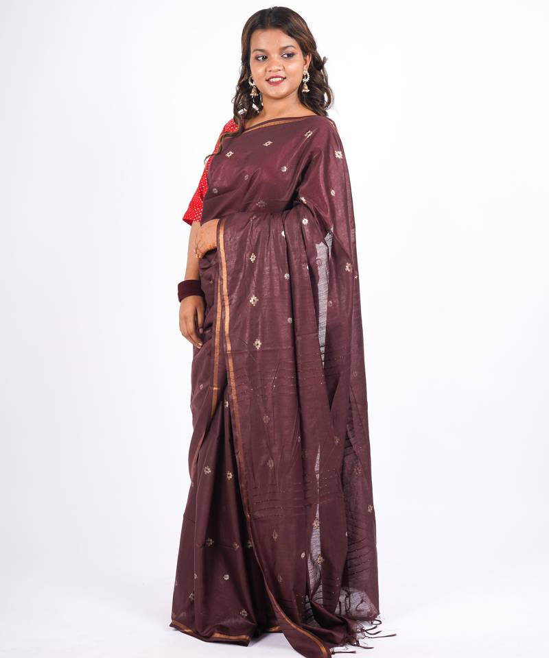 | Product Name | Brown Zari Work, Sequence Cotton Silk Blend Bhagalpuri Ethnic Saree With Unstitched Blouse | |