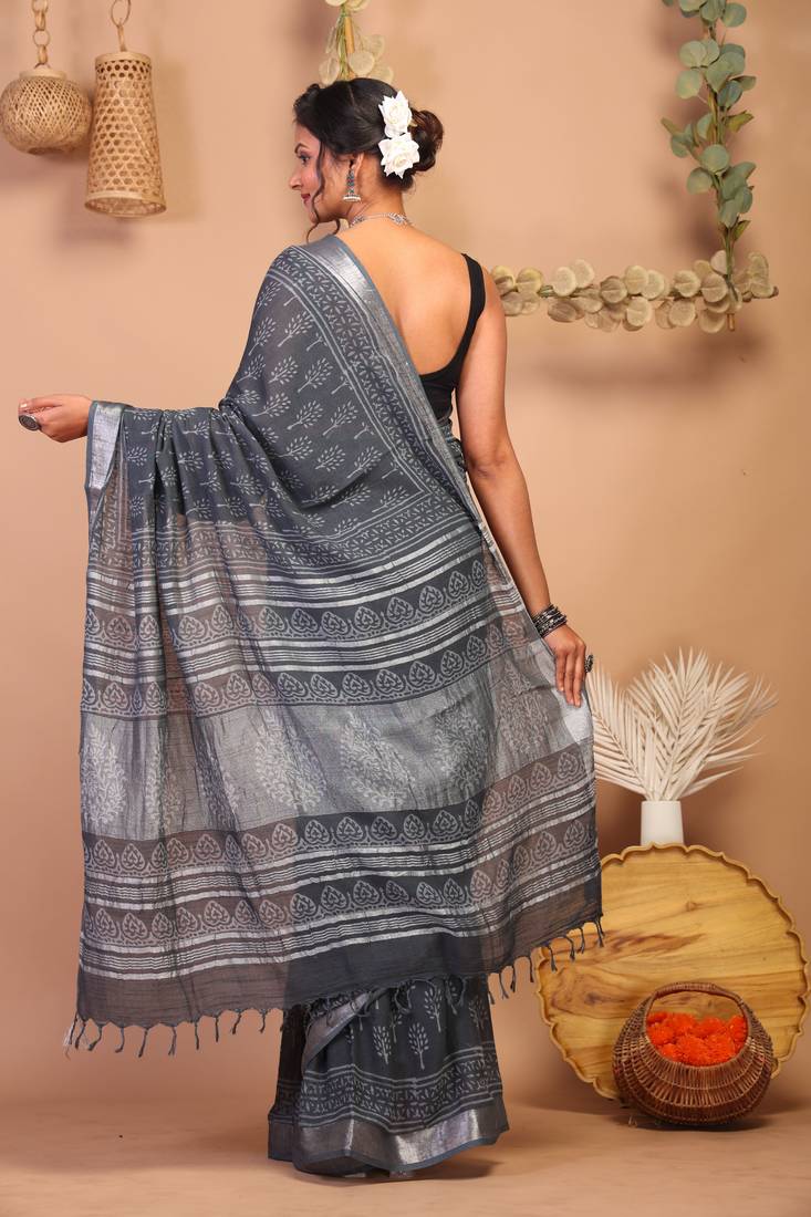 | Product Description | An Elegant Gray Bhagalpuri Cotton Linen Saree, Perfect For A Sophisticated Look. The Saree Features A Soft Sheer Texture And Drapes Gracefully Featuring Handblock Printed Motifs With Silver Broad Border. The Neutral Color Adds Versatility, Making It Suitable For Various Occasions. Complete It With Our Matching Handblock Printed Blouse And Accessories For A Classic Yet Contemporary Ensemble. |