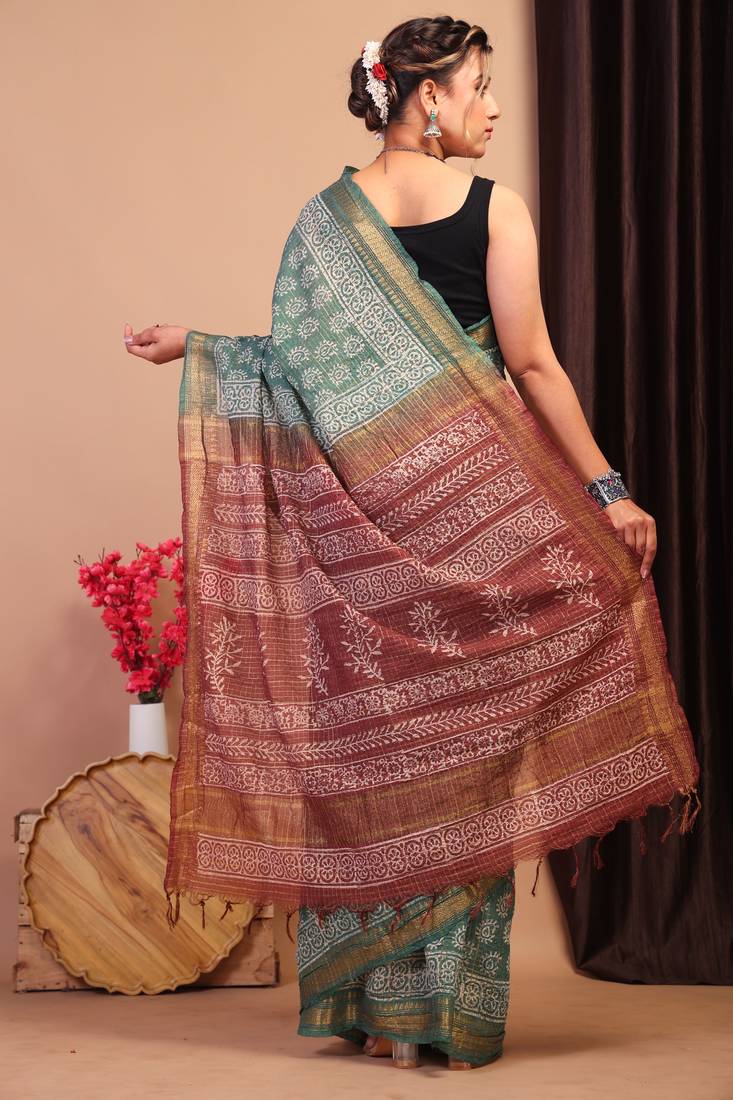 Green & brown zari work, dabu embroidery cotton silk blend bhagalpuri ethnic saree with unstitched blouse