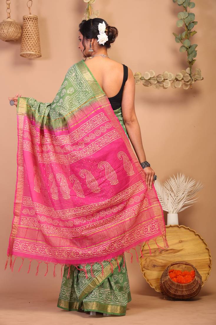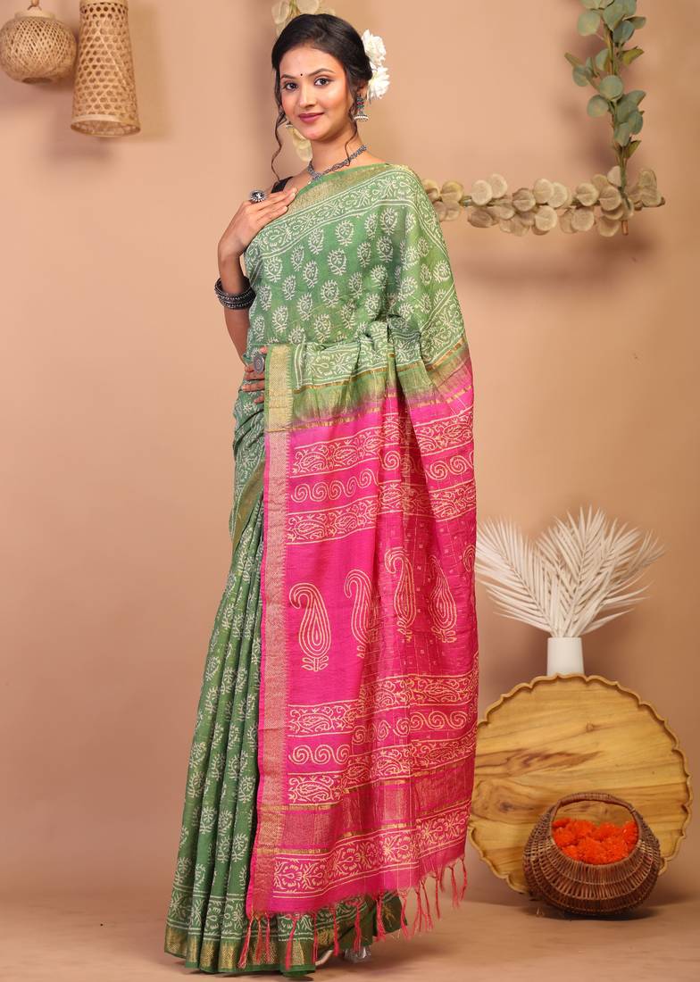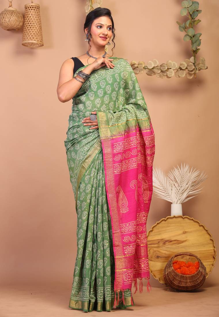 Green & pink zari work cotton silk blend bhagalpuri ethnic saree with unstitched blouse