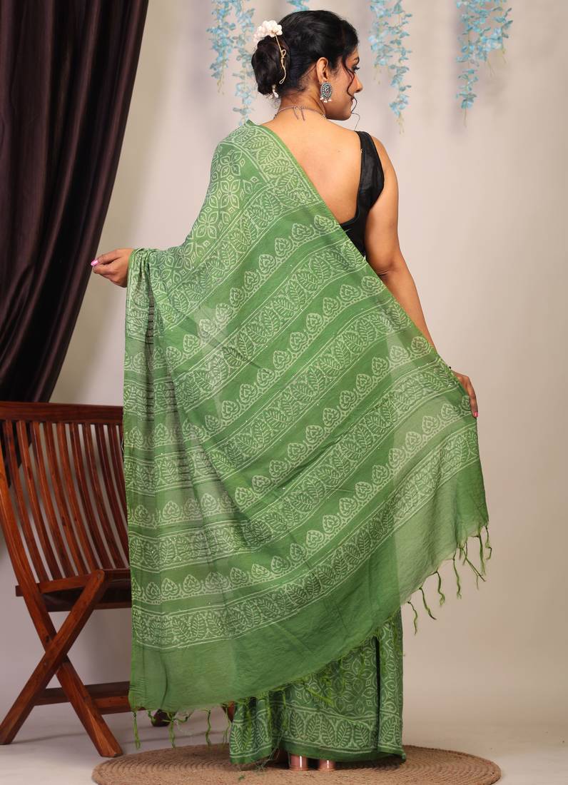 Green sequence cotton silk blend bhagalpuri ethnic saree with unstitched blouse