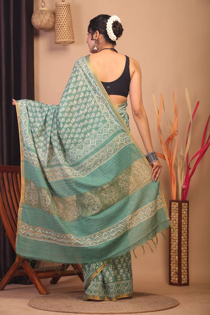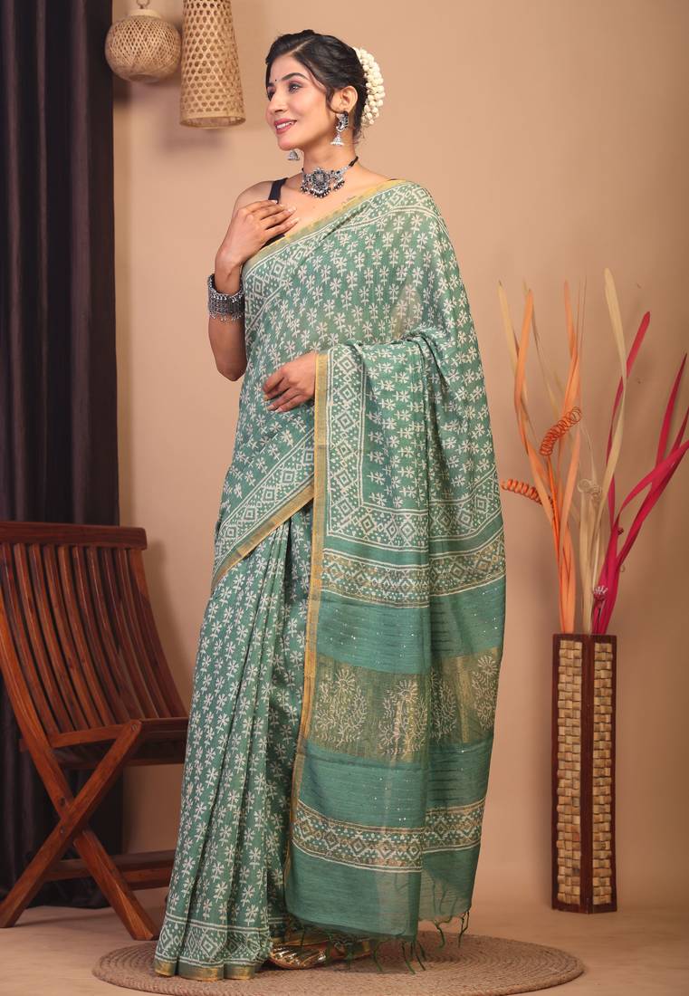 Green zari work, sequence cotton silk blend bhagalpuri ethnic saree with unstitched blouse