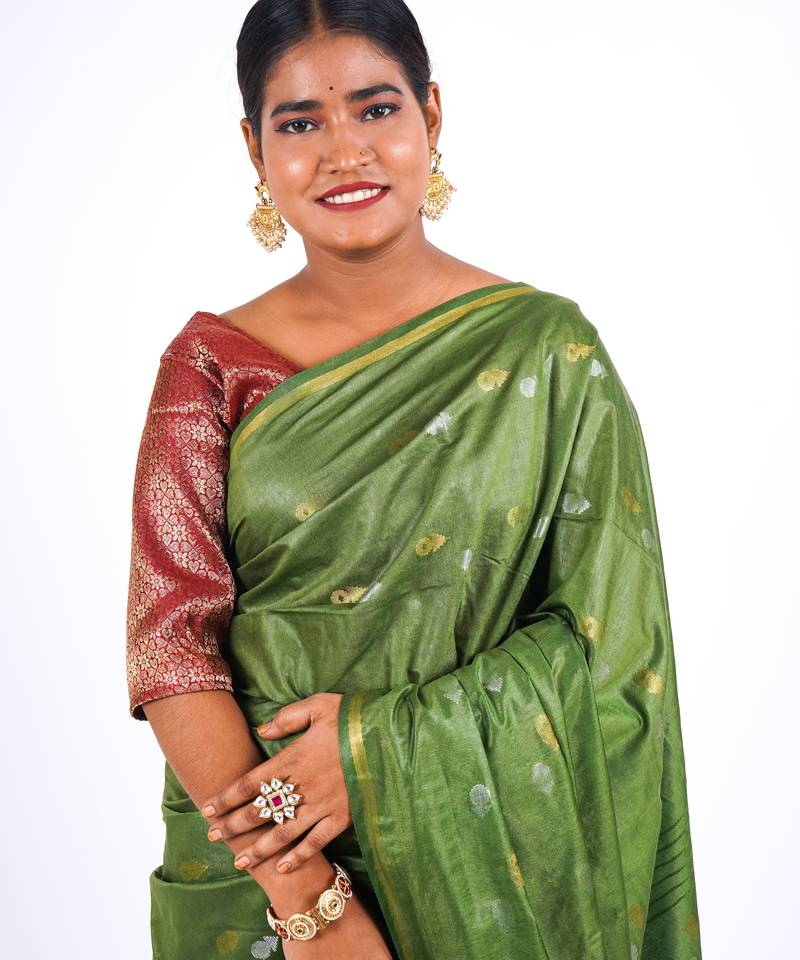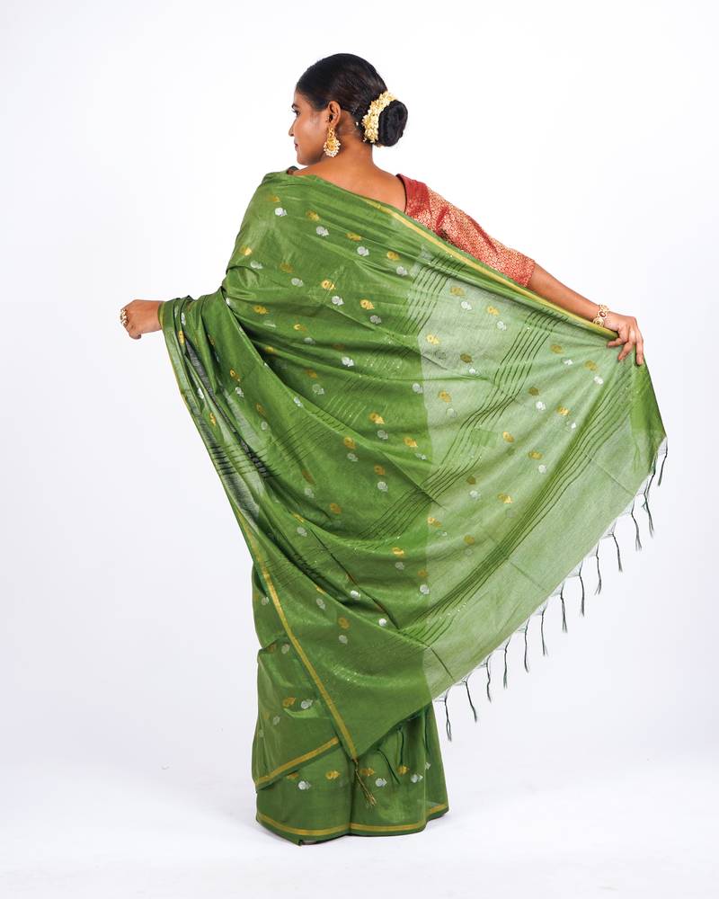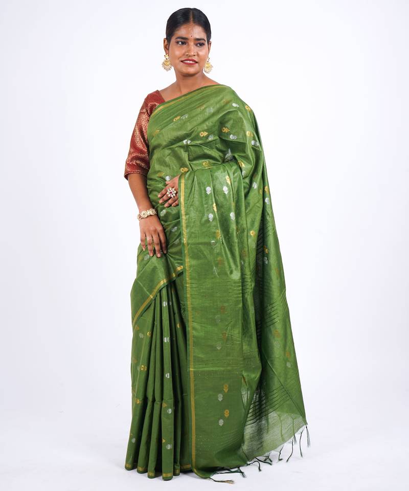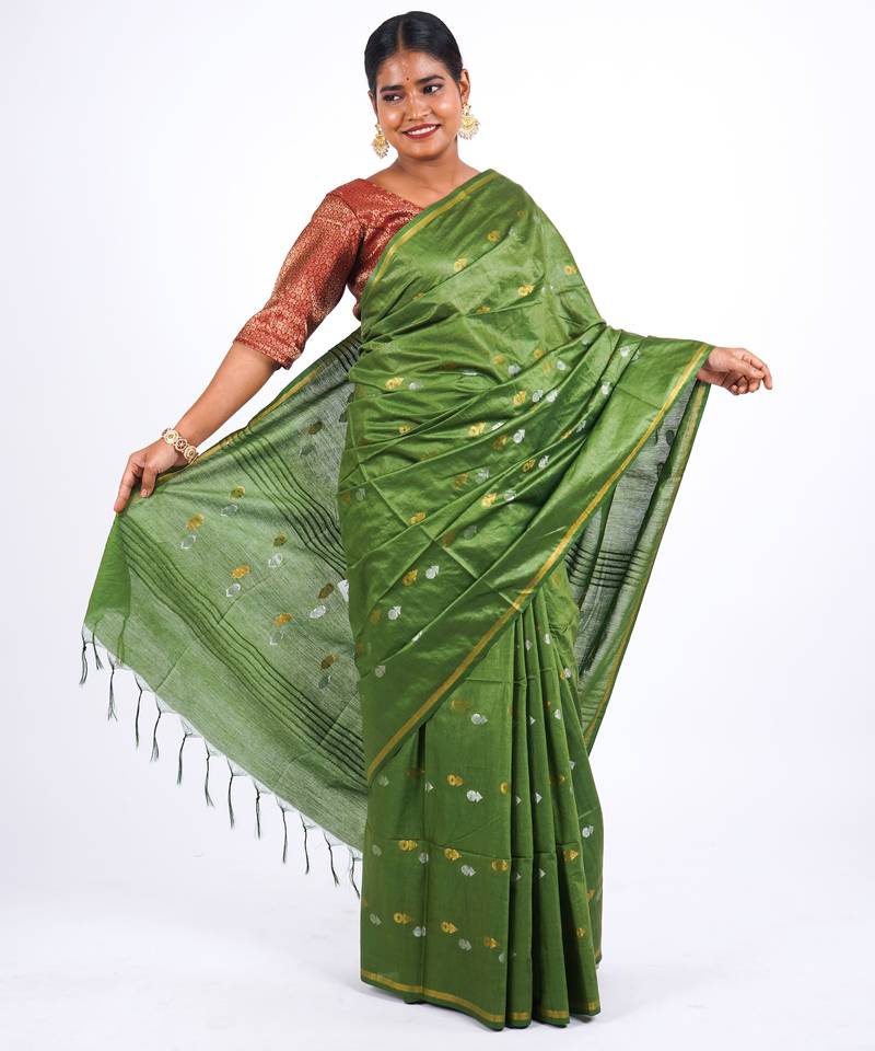 | Product Description | Enhance Your Ethnic Look With This Anuttara Women’s Bhagalpuri Cotton Silk Saree In A Rich Green Shade. Decorated With Zari Buta Motifs, Delicate Embellishments, And Shimmering Sequins, It Beautifully Blends Traditional Artistry With Festive Glamour. The Frill Detailing Adds A Stylish Touch, Making It A Perfect Saree For Weddings And Celebrations.Crafted From Premium Cotton Silk, This Saree Is Lightweight, Breathable, And Drapes Elegantly. |