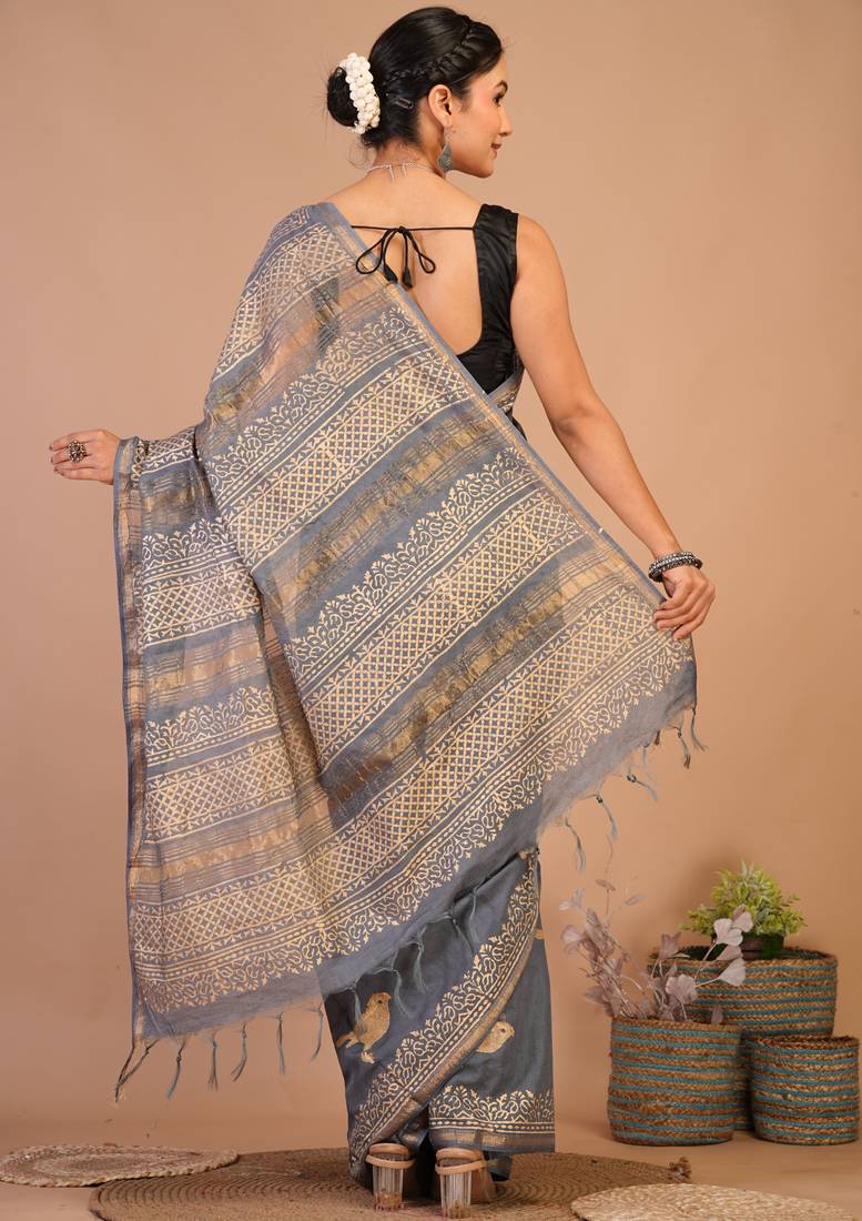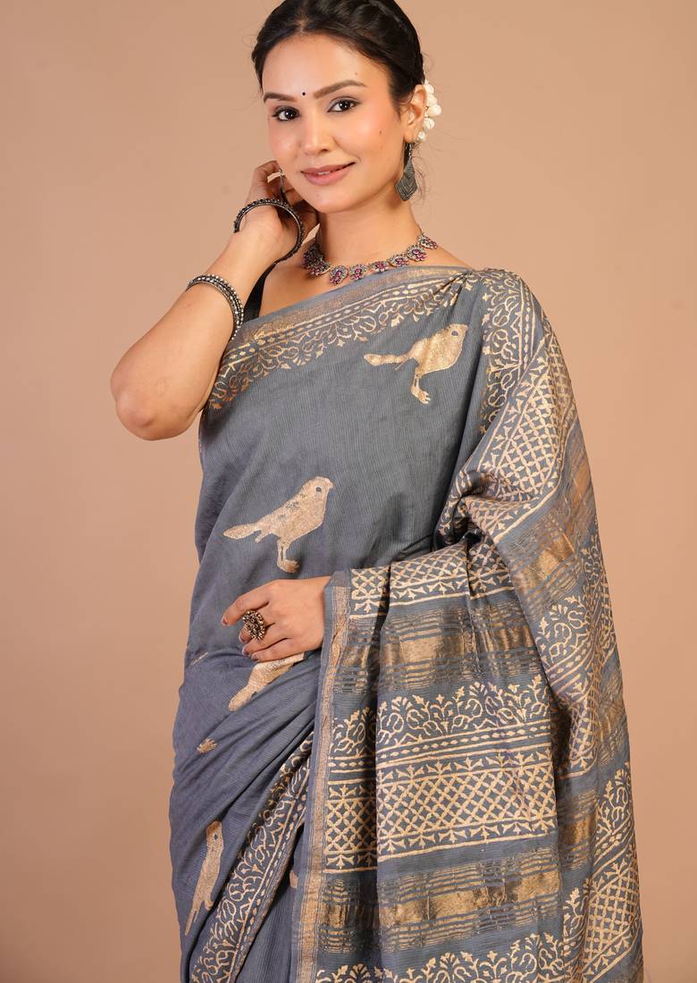 | Product Description | This Saree Beautifully Marries Tradition And Style With Delicate Hand Block Prints Enhanced By Shimmering Golden Foil Accents, Creating A Subtle Yet Captivating Design That Speaks Volumes Without Saying A Word.The Soothing Grey Base Exudes Calm Sophistication, While The Thin Golden Zari Border Adds A Refined Sparkle, Perfect For Weddings, Festive Occasions, And Cultural Celebrations. |