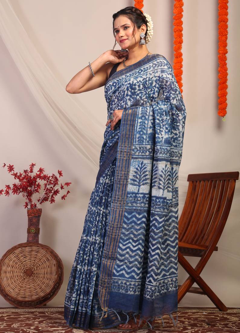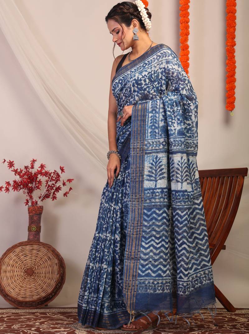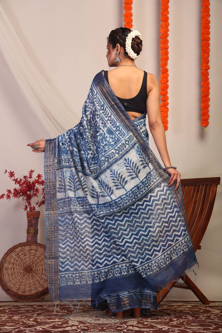 | Product Description | Turn Every Occasion Into A Celebration Of Style With This Stunning Indigo Blue Bhagalpuri Cotton Silk Saree. Featuring Bold Hand Block Floral And Zig Zag Motifs, It Captures The Essence Of Traditional Artistry With A Contemporary Twist. Embellished With Graceful Frills, Fine Zari Detailing, And A Rich Golden Border, This Saree Brings Elegance And Grandeur Together In Perfect Harmony. |