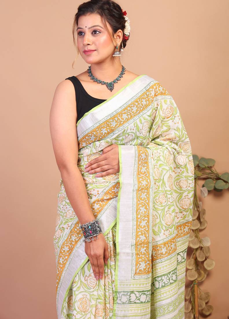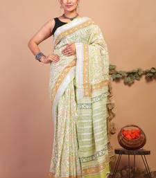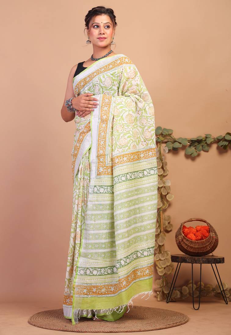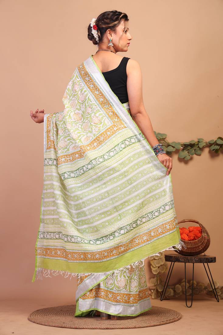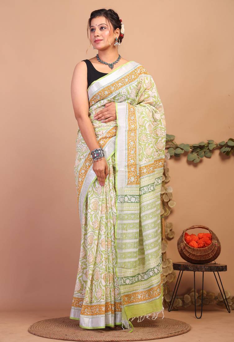 Lime green zari work cotton linen bhagalpuri ethnic saree with unstitched blouse