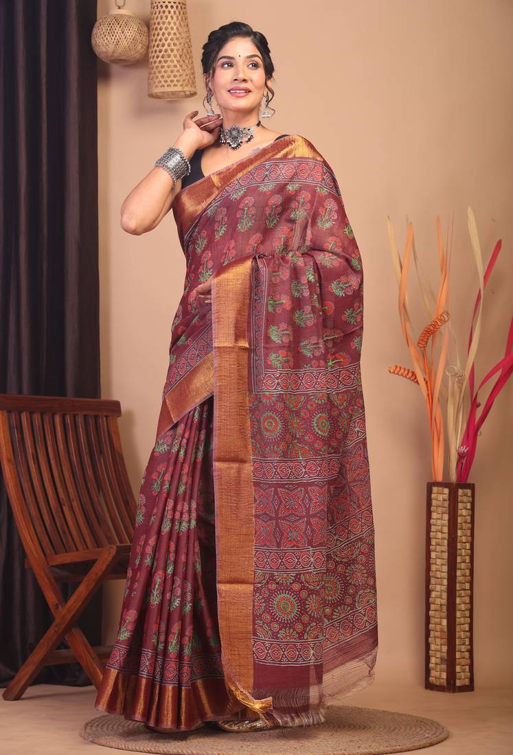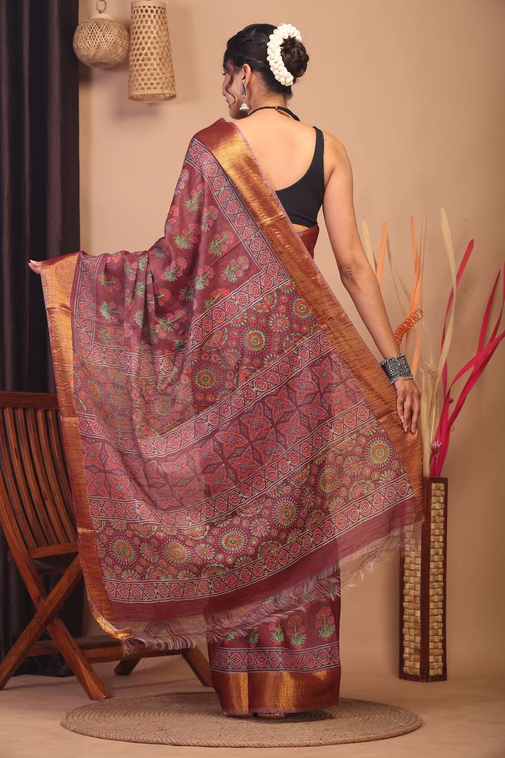 | Product Description | Elevate Your Style And Make A Statement With The Maroon Bhagalpuri Cotton Silk Ethnic Saree. This Saree Combines The Richness Of Bhagalpuri Weaving With The Exquisite Artistry Of Traditional Block Printing. The Stunning Maroon Color, Adorned With A Golden Border, Adds A Touch Of Luxury To Your Look. |
