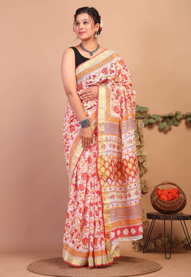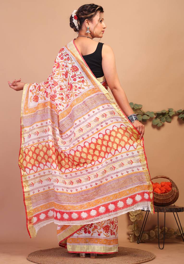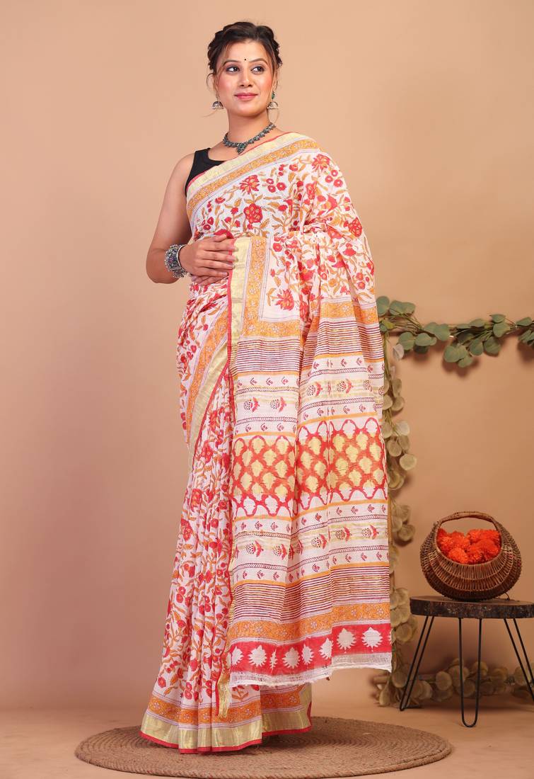 Presenting The Multicolored Bhagalpuri Cotton Linen Saree — A Dazzling Creation That Captures The Golden Essence Of Prosperity. Crafted In Rich, Deep Hues, The Saree Exudes A Sense Of Sophistication And Charm, Making It Effortlessly Comfortable. The Linen Fabric Adds A Touch Of Luxury While Offering Comfort, Flaunting Authentic Floral Handblock Printed Motifs With Broad Golden Zari Border. Perfect For Both Formal And Festive Occasions, This Saree Promises A Classic And Elegant Look.