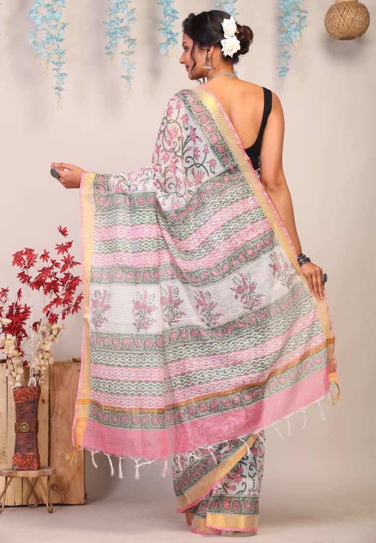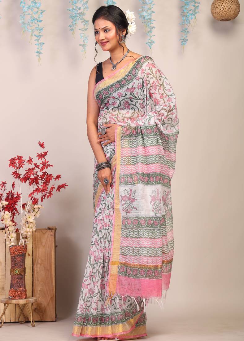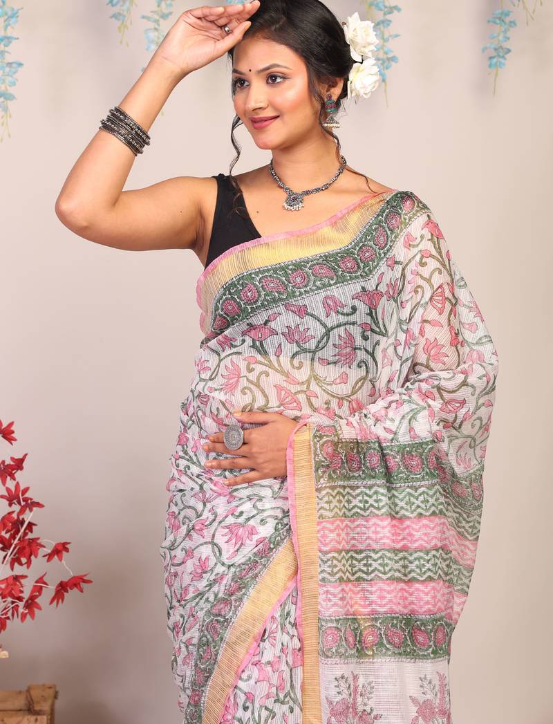 | Product Description | Drape Yourself In The Timeless Charm Of Our Multicolored Kota Doria Cotton Silk Saree, A Masterpiece Of Heritage Craftsmanship. Adorned With Exquisite Floral Hand Block Prints, This Saree Is A True Celebration Of Tradition And Artistry.The Delicate Golden Zari Border Lends A Regal Touch, Shimmering Gracefully With Every Fold, While The Subtle Frill Detailing Adds A Hint Of Contemporary Allure. |