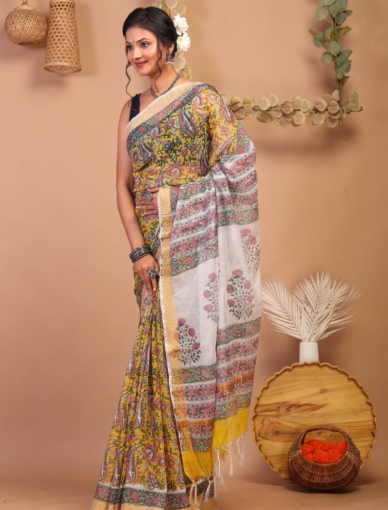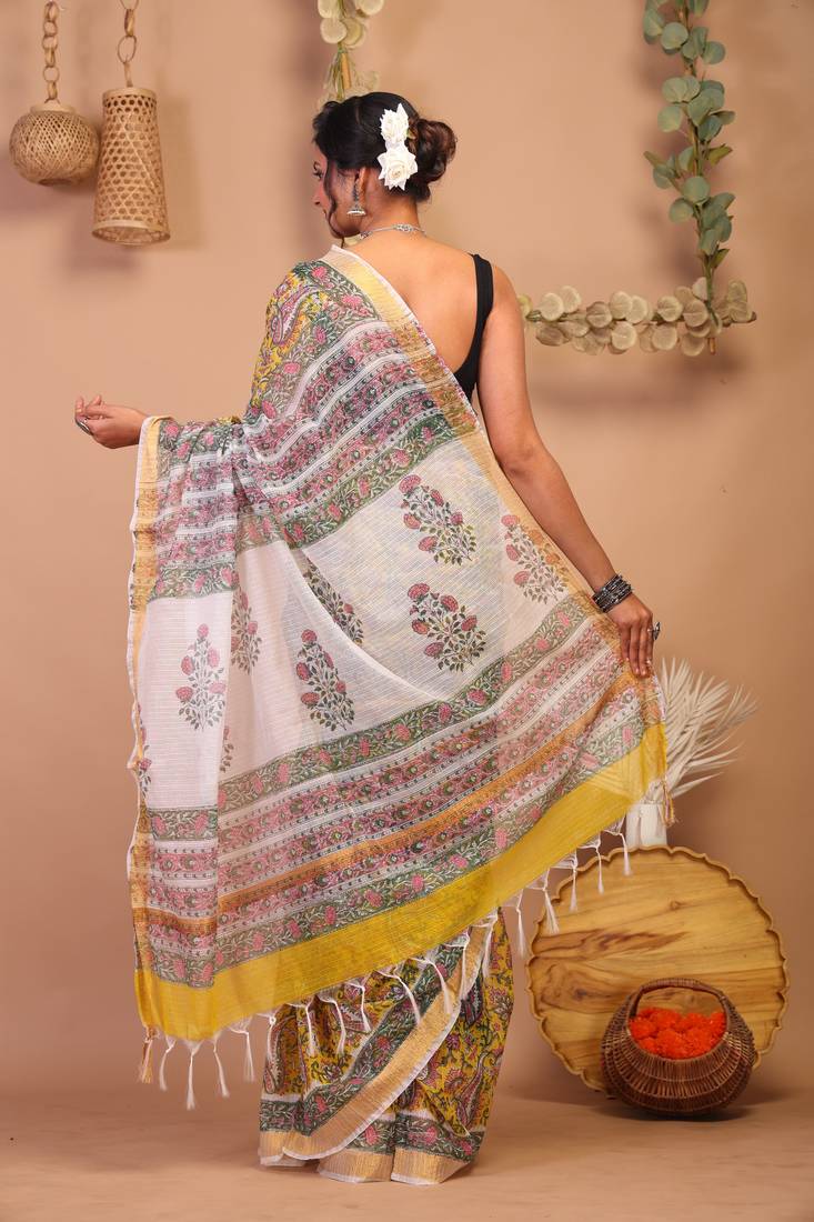 | Product Description | Forget Your Regular Saree Style With Our Multicolored Kota Doria Cotton Silk Saree, Where Heritage Meets Artistry In Perfect Harmony. Adorned With Stunning Floral Hand Block Prints, This Saree Is A True Tribute To The Rich Traditions Of Craftsmanship.A Regal Golden Zari Border Gracefully Weaves Its Magic, Catching The Light With Every Movement, While The Delicate Frill Detailing Adds A Modern, Chic Twist. |