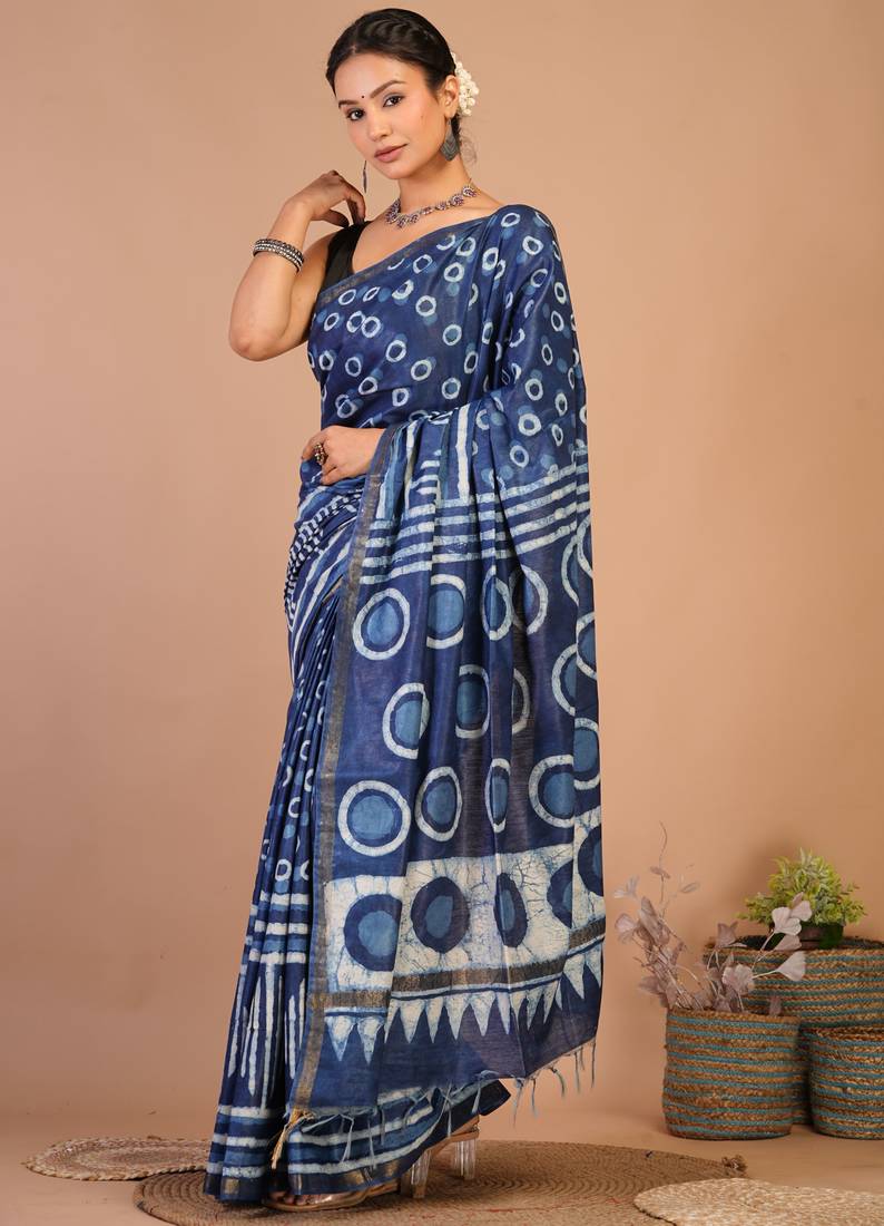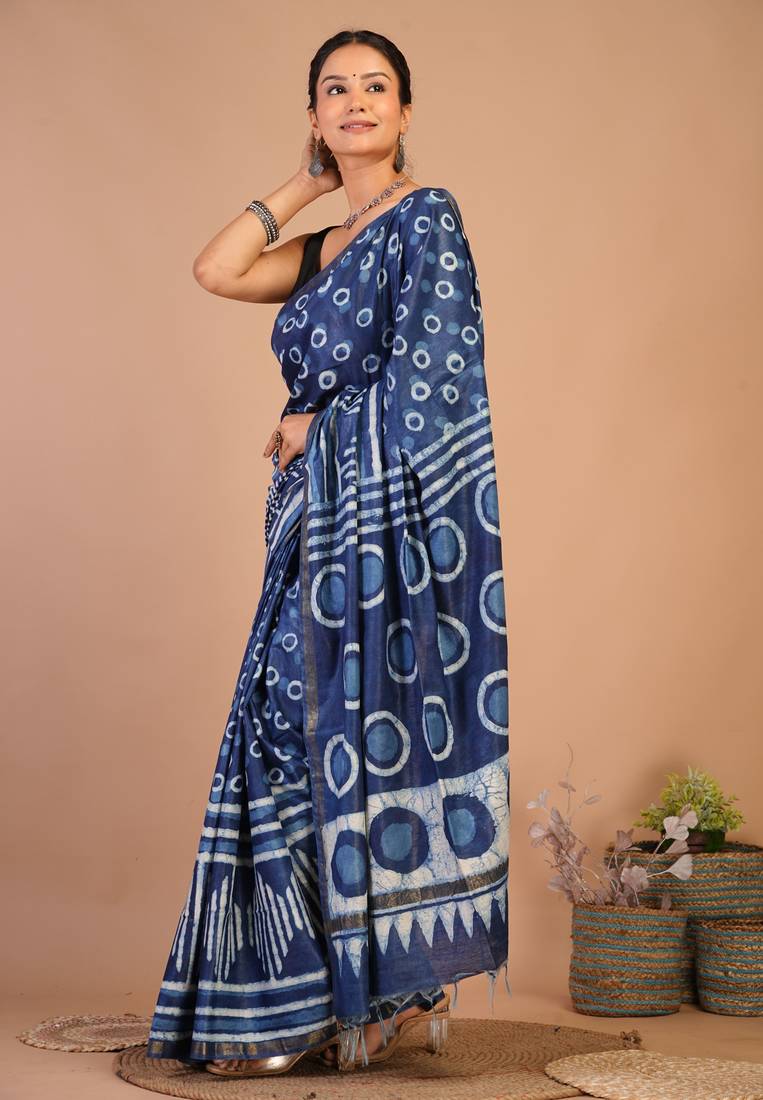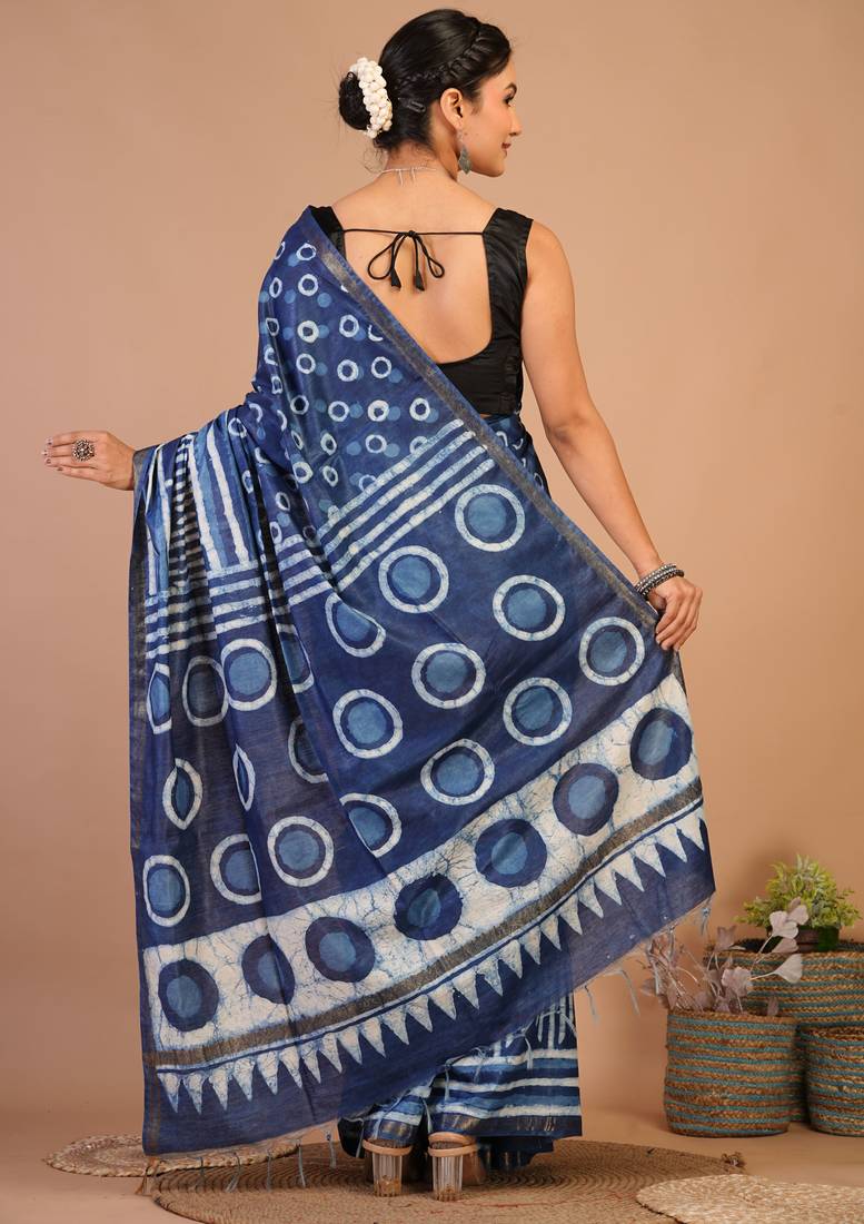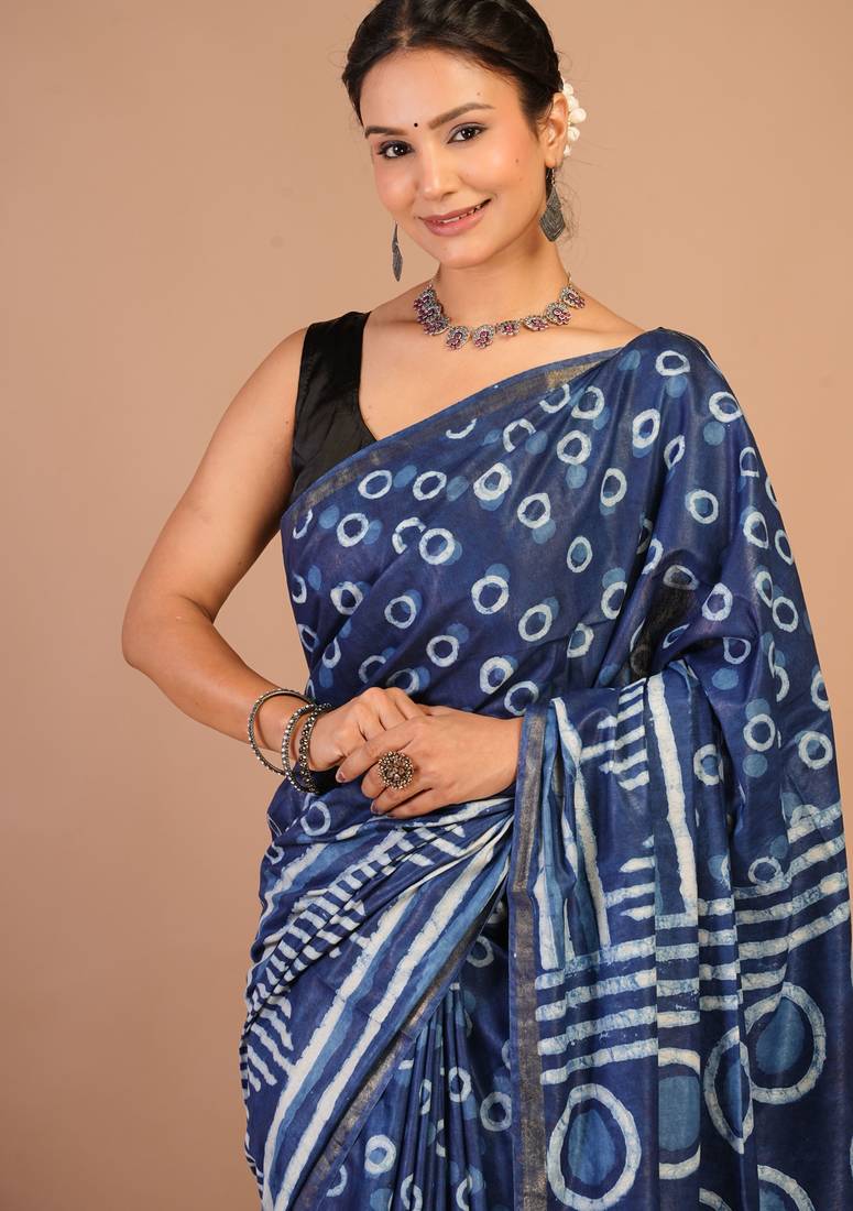 | Product Description | Made From Soft, Breathable Cotton Silk (Art Silk), This Saree Features The Beauty Of Dabu Hand Block Printing, Known For Its Rustic Charm And Rich Cultural Roots.The Bold Navy Blue Hue Is Elevated With A Slim Golden Zari Border That Adds Just The Right Touch Of Sophistication. Adorned With Fancy Tassels And Subtle Zari Embellishments, This Saree Is Designed To Make You Shine During Weddings, Festive Occasions, Or Traditional Events. |