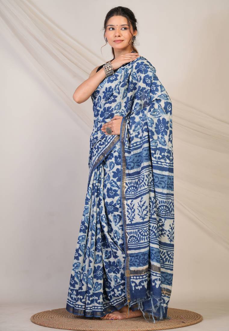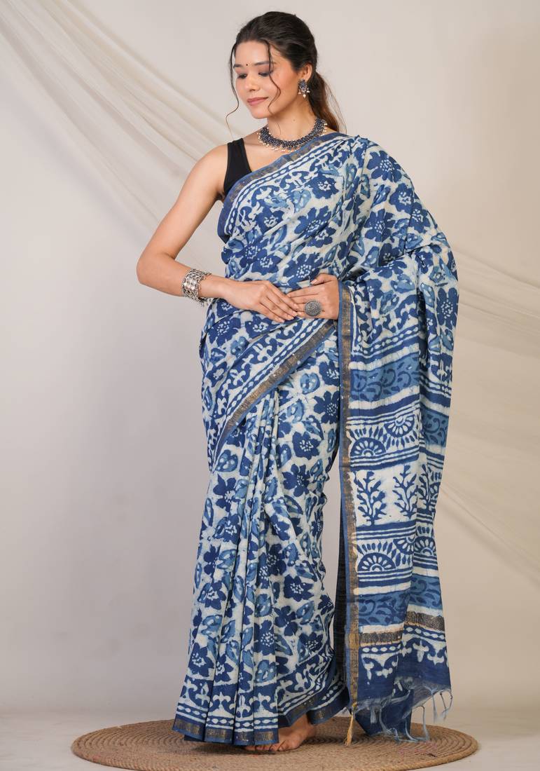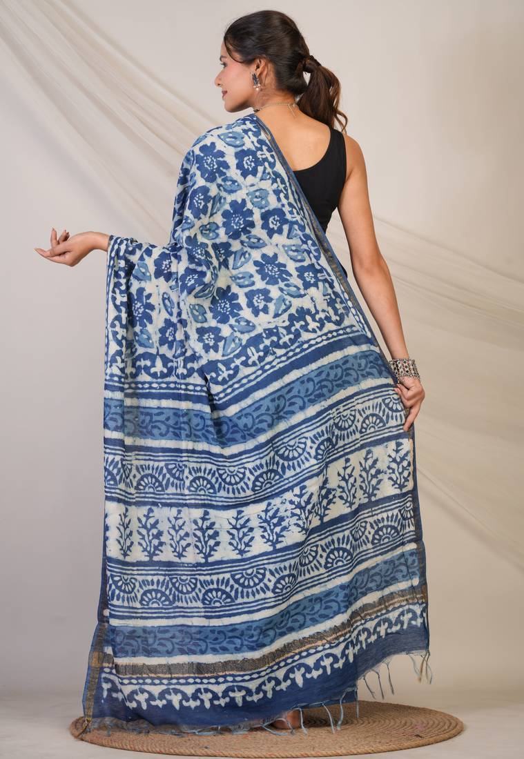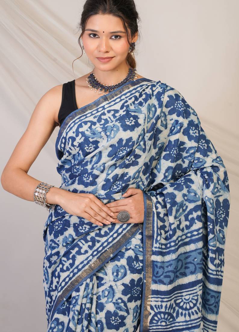 Navy blue zari work cotton silk blend bhagalpuri ethnic saree with unstitched blouse