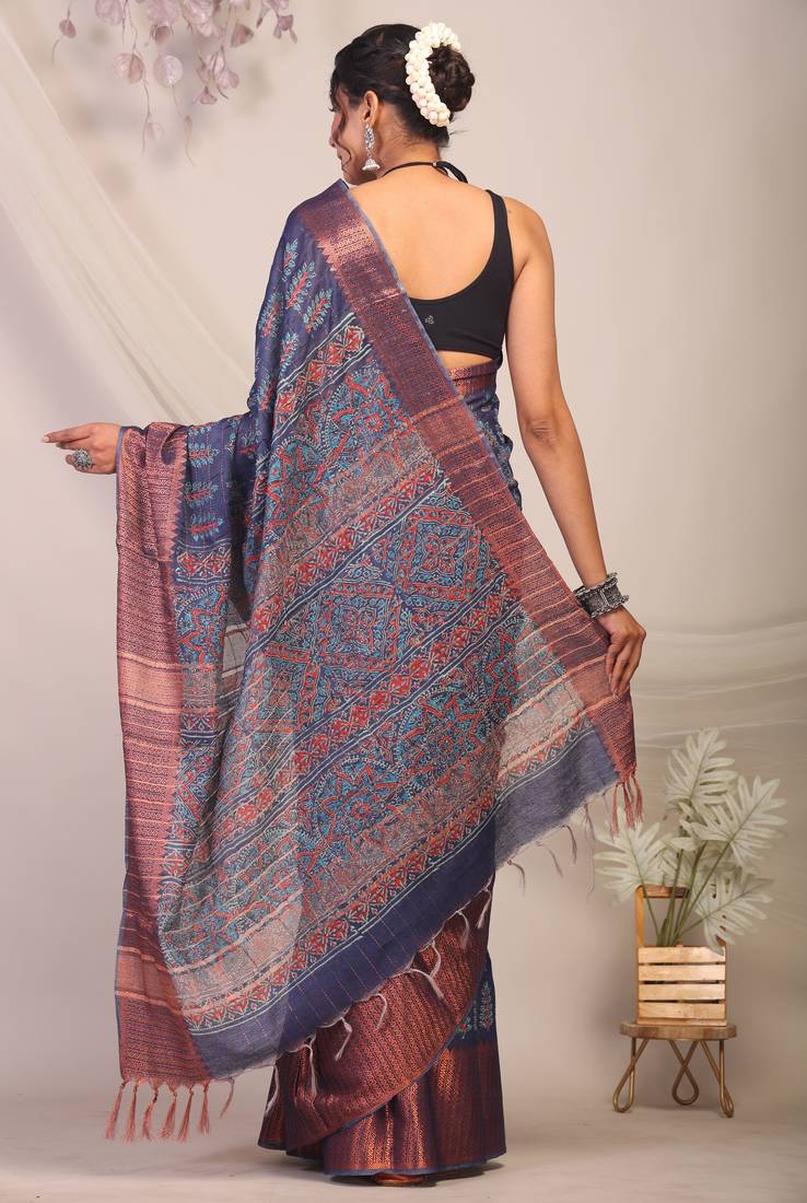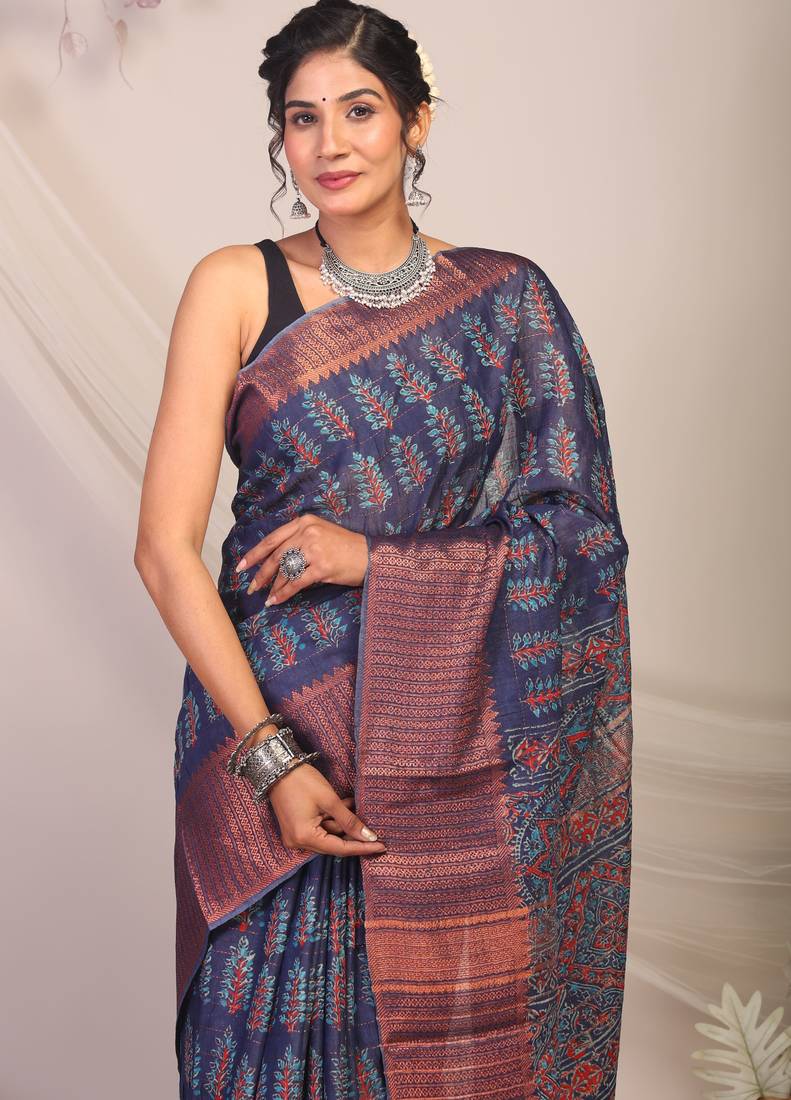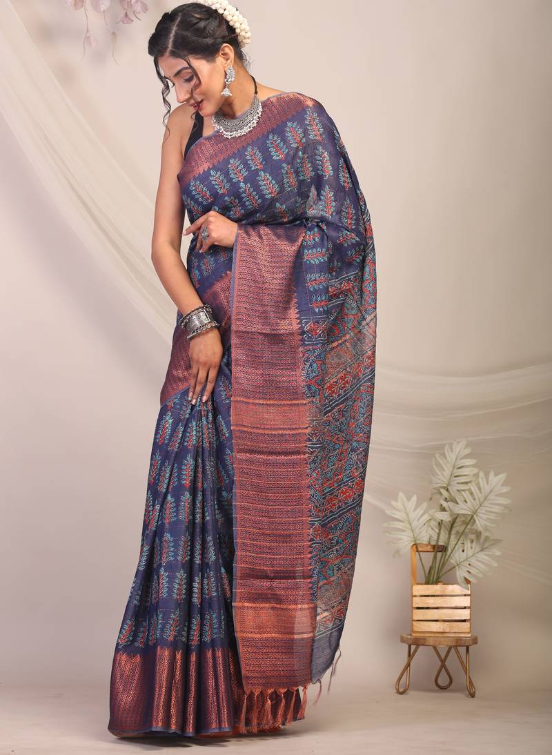 | Product Description | Turn Heads At Every Celebration With Our Navy Blue Bhagalpuri Cotton Silk Saree — A Rich Tribute To Indian Heritage And Craftsmanship. Featuring Bold Ajrakh Hand Block Prints, Intricate Zari Detailing, Delicate Frills, And A Stunning Dabu Style Golden Border, This Saree Blends Timeless Beauty With Regal Charm. |