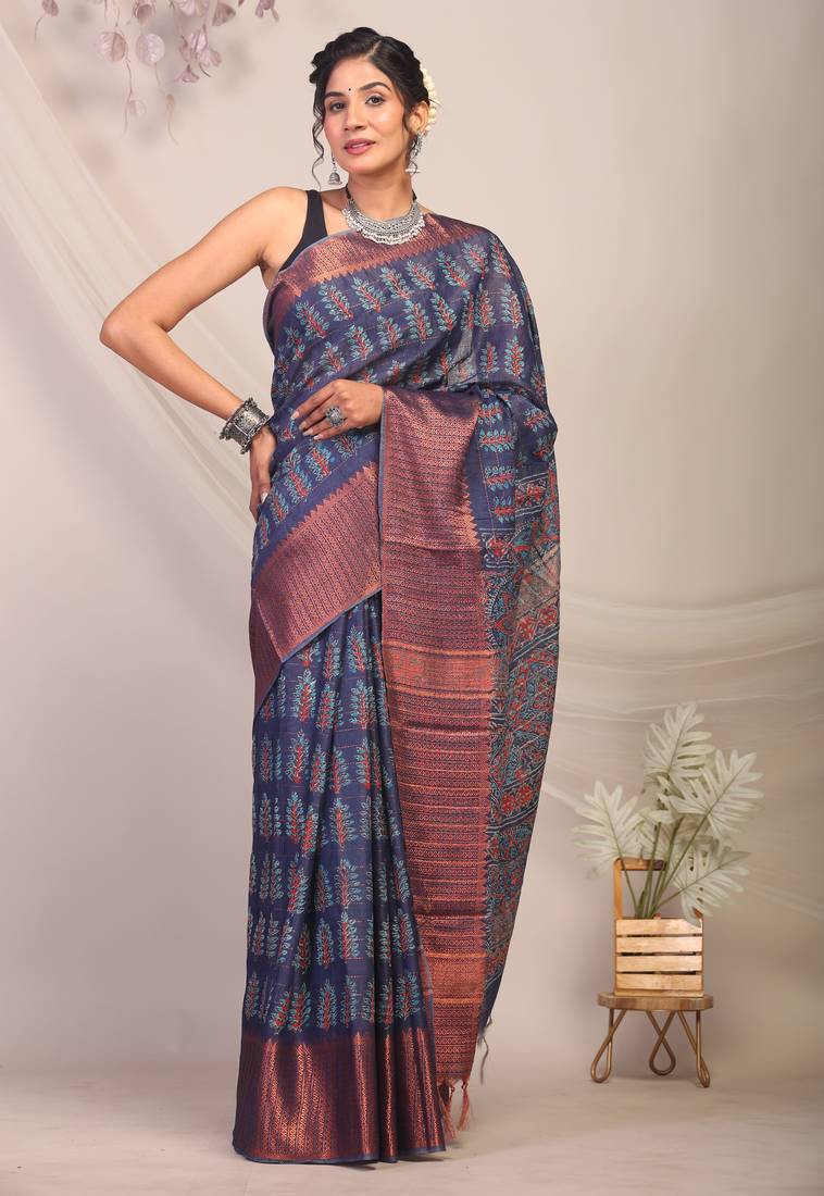 Navy blue zari work, dabu embroidery cotton silk blend bhagalpuri ethnic saree with unstitched blouse