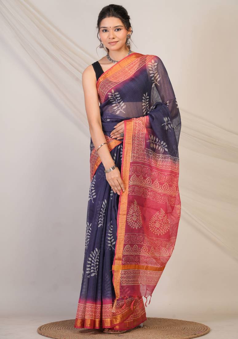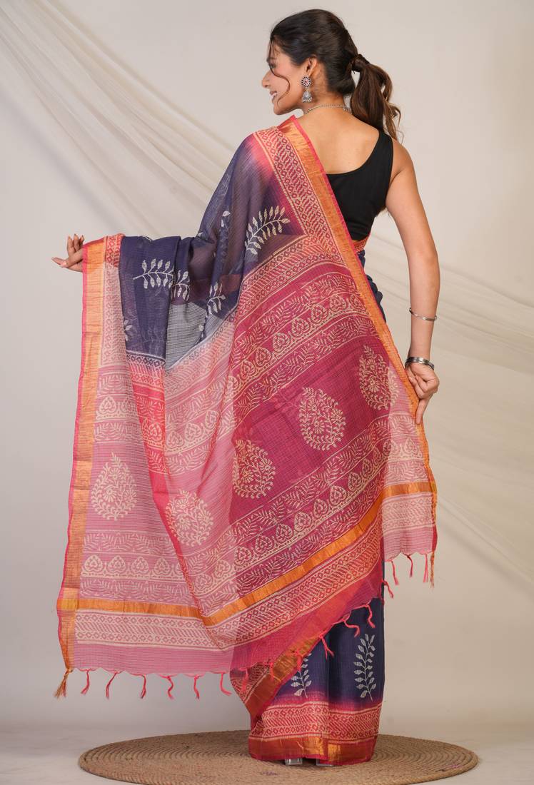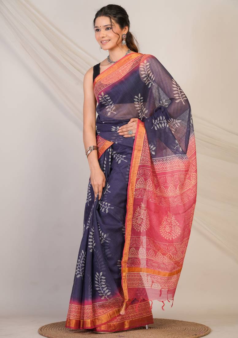 Navy & pink zari work kota doria kota doria ethnic saree with unstitched blouse
