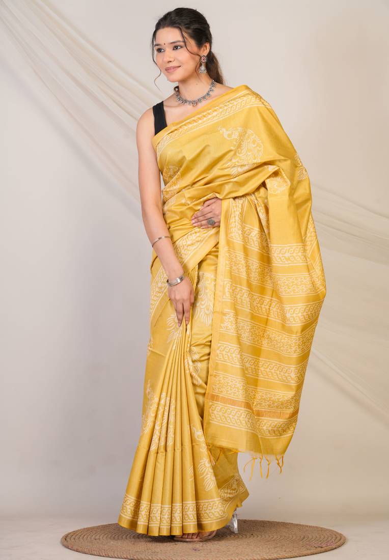 | Product Description | The Unique Olive Green Shade Is Both Grounding And Graceful, Brought To Life With Intricate Discharge Hand Block Printing Featuring Majestic Peacock Motifs—A Timeless Symbol Of Elegance And Pride. A Thin Golden Zari Border Weaves In Richness, While Fancy Tassels On The Pallu Add A Modern, Graceful Finish.Paired With A Matching Cotton Silk Blouse Piece, This Saree Is Perfect For Weddings, Festive Gatherings, And Special Celebrations—Where Tradition, Style, And Storytelling Meet. |