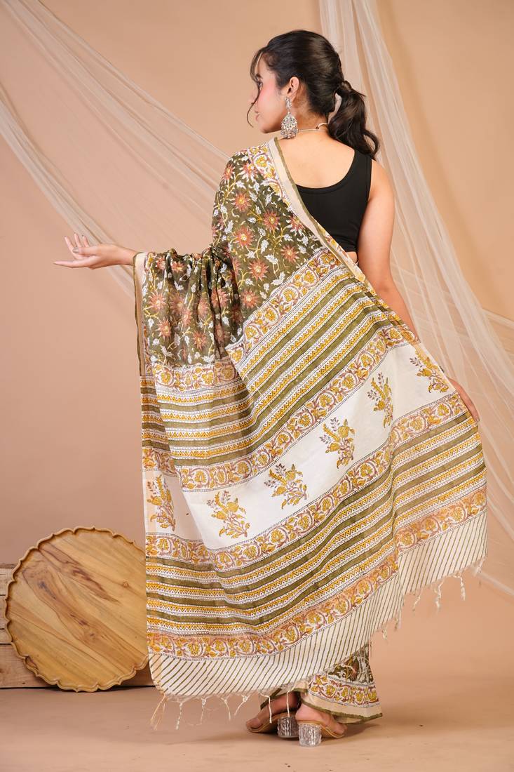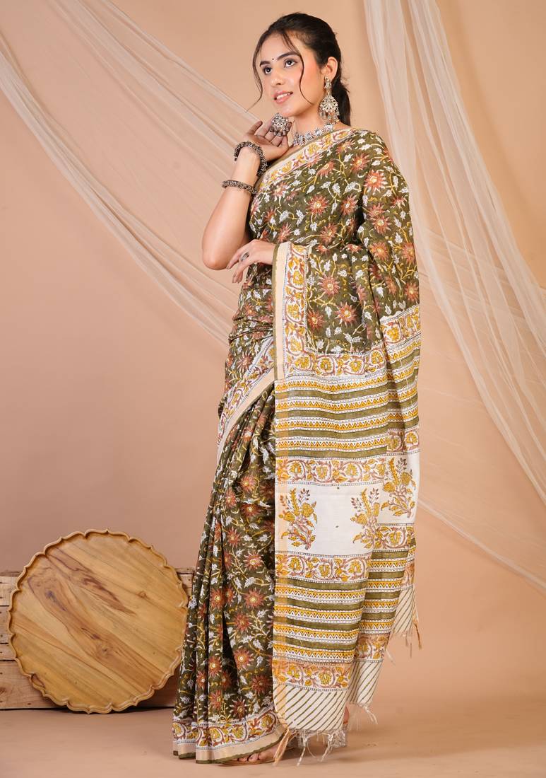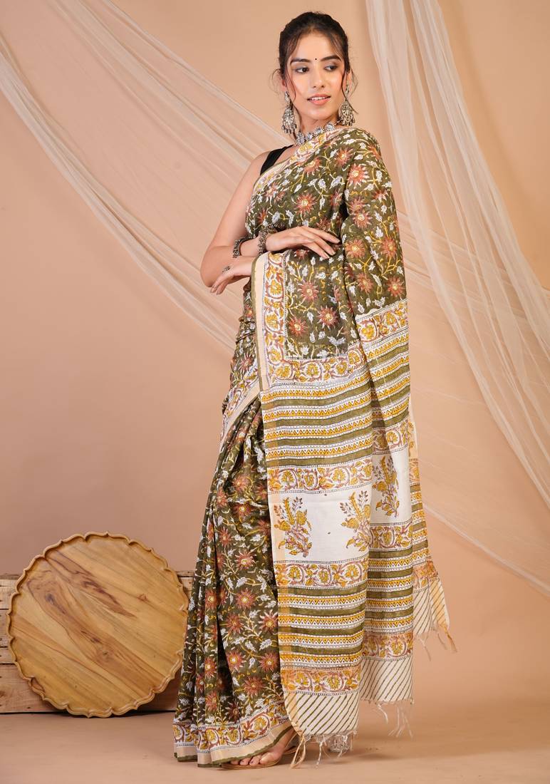 Olive green zari work, tassle cotton silk blend bhagalpuri ethnic saree with unstitched blouse