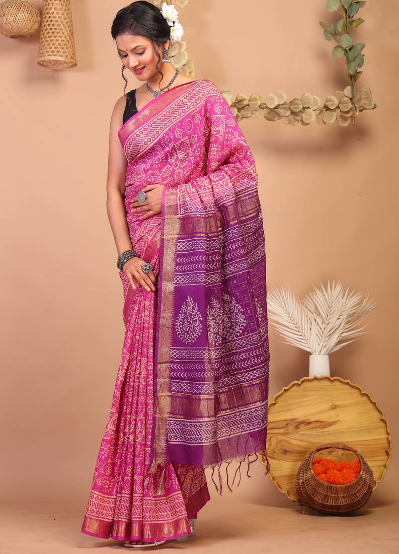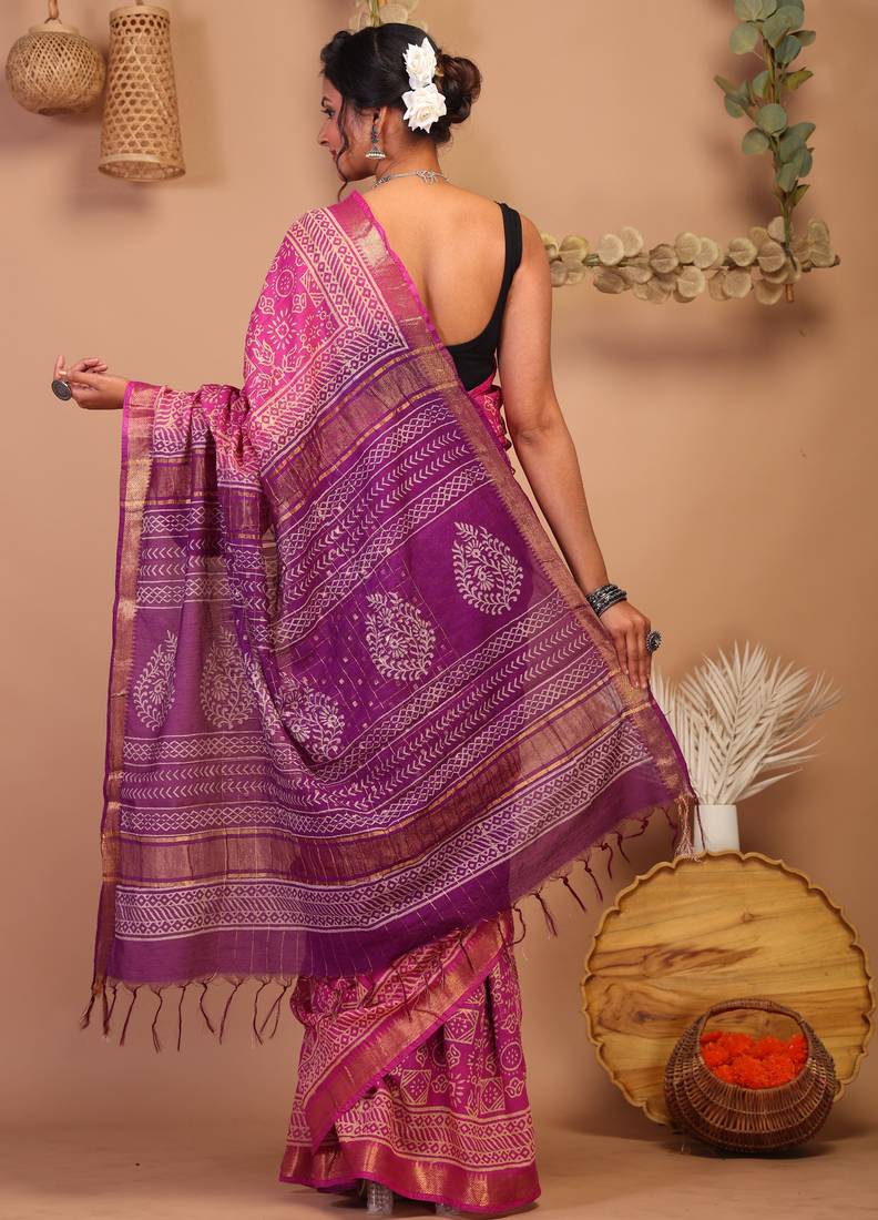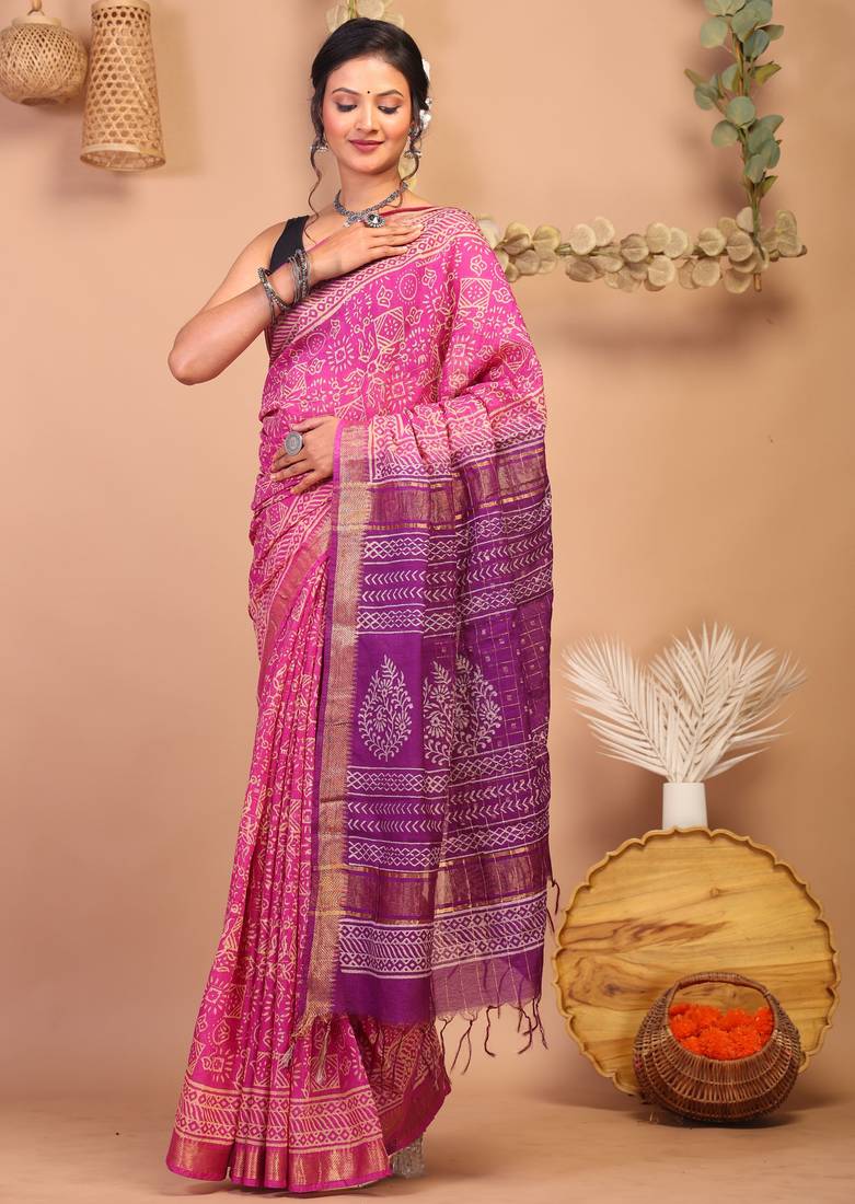 Add A Touch Of Heritage To Your Wardrobe With This Pink/Purple Bhagalpuri Cotton Silk Saree, Beautifully Adorned With Tribal Handblock Print Further Enhanced With Intricate Embroidery Of Zari Work And Frills. This Masterpiece Combines Traditional Craftsmanship Of Block Printing With Modern Elegance Of Bhagalpuri Weave, Making It A Stunning Choice For Weddings, Festive Occasions, And Cultural Celebrations.