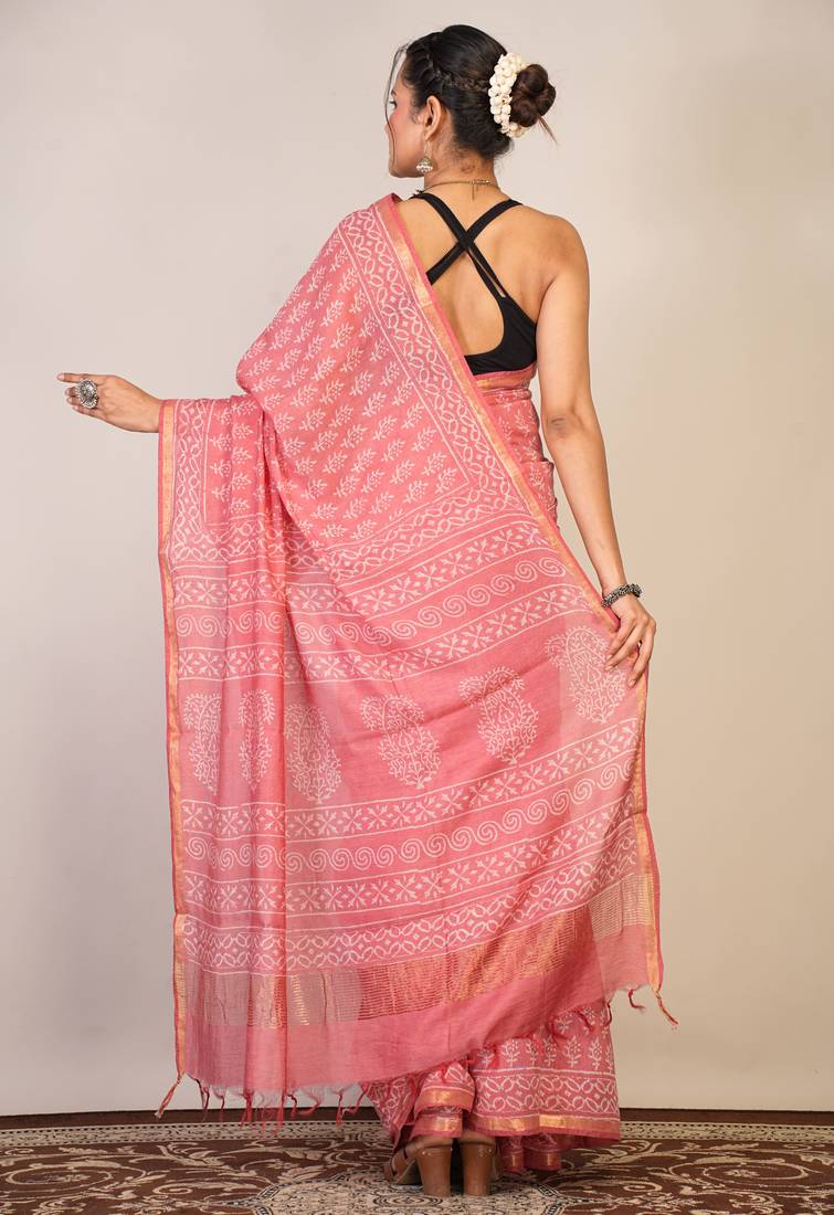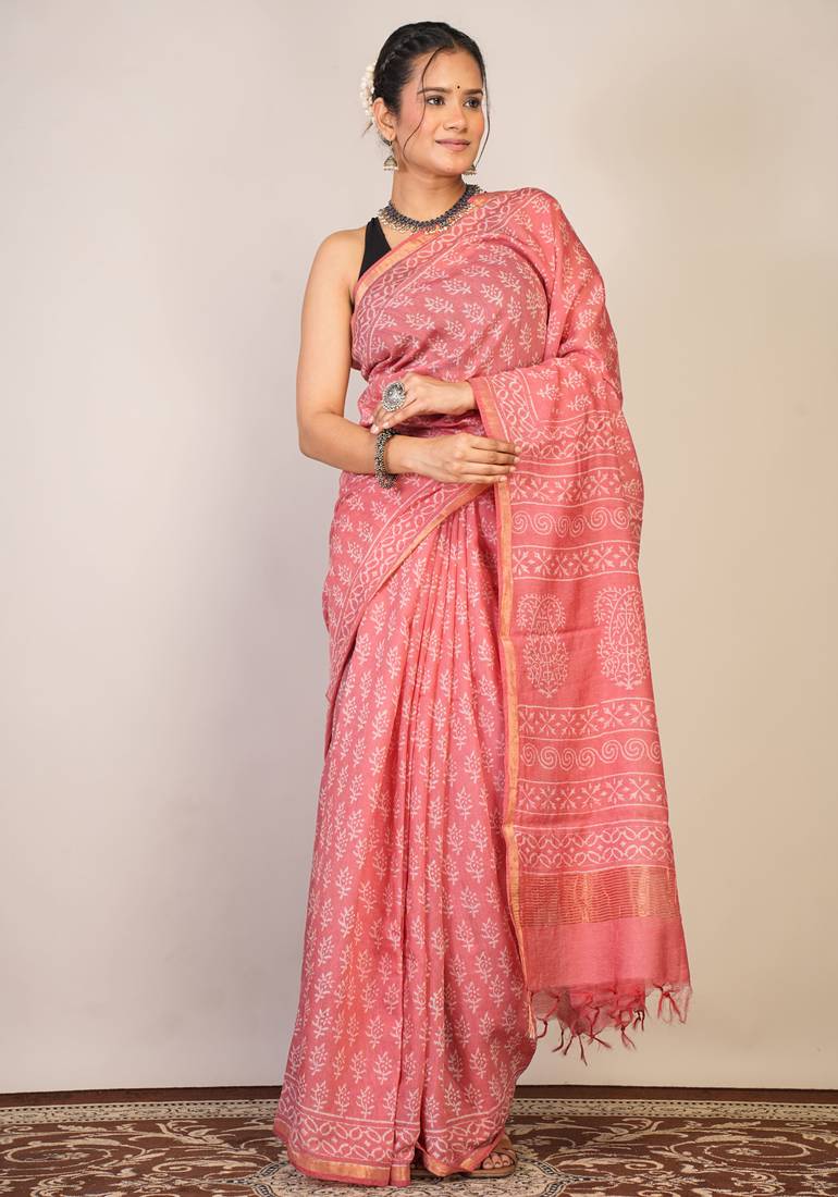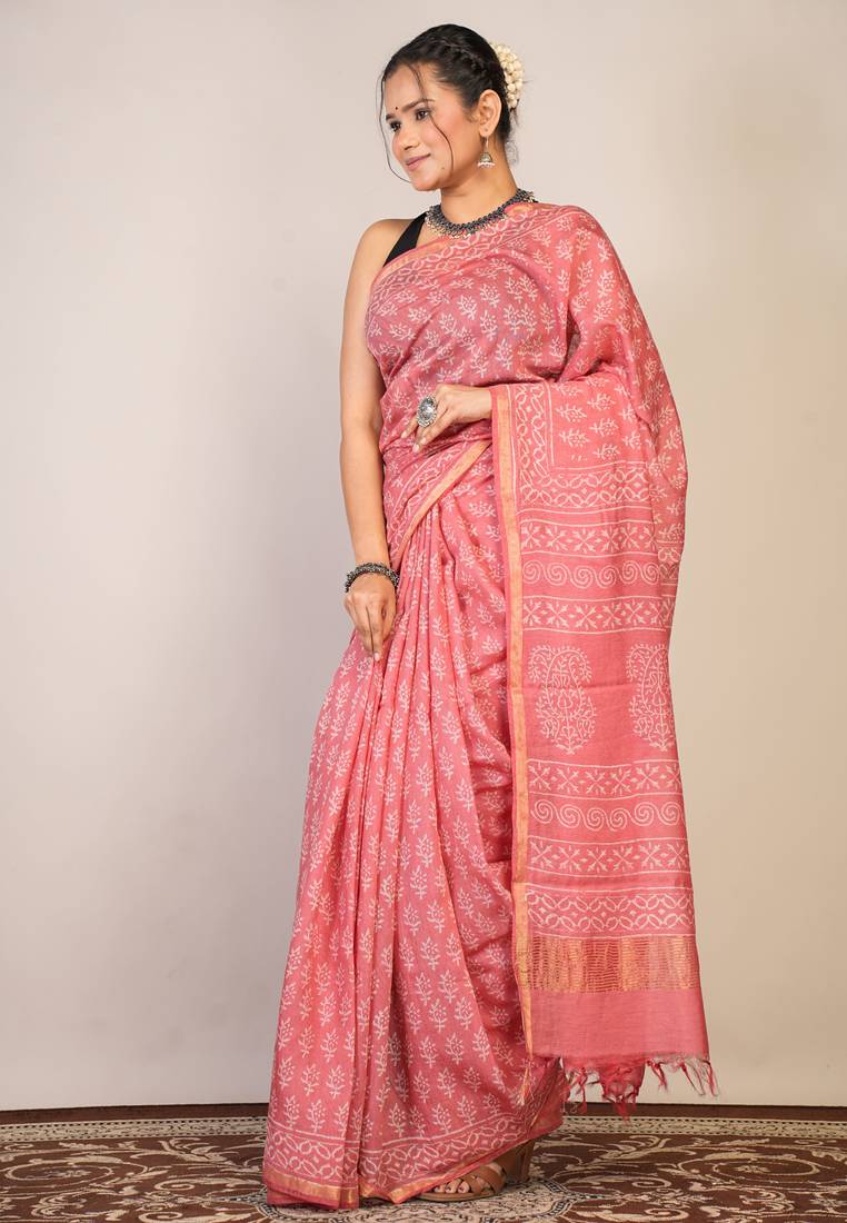 | Product Description | Perfectly Designed For Those Who Cherish Timeless Ethnic Charm With A Modern Touch.The Delicate Pink Shade Exudes Femininity And Warmth, Beautifully Enhanced By Intricate Floral Hand Block Prints That Speak Of Masterful Craftsmanship. A Slender Golden Zari Border Adds A Radiant Shimmer, While Exquisite Zari Embellishments And Playful Tassels Complete This Festive Masterpiece. |