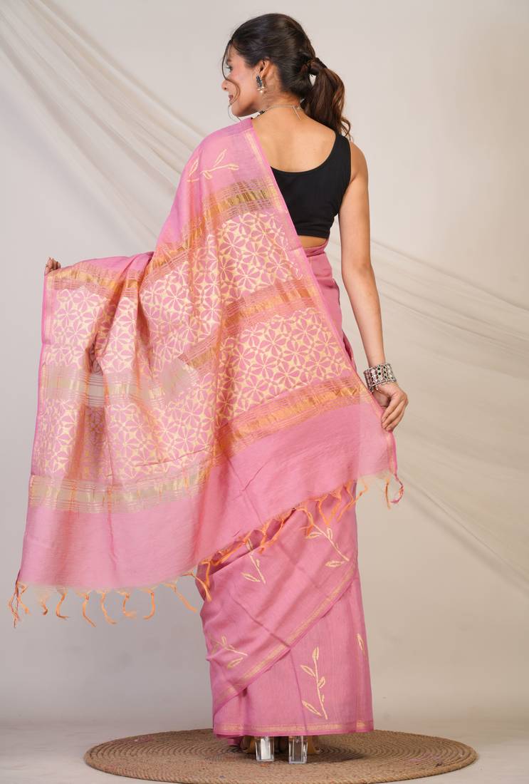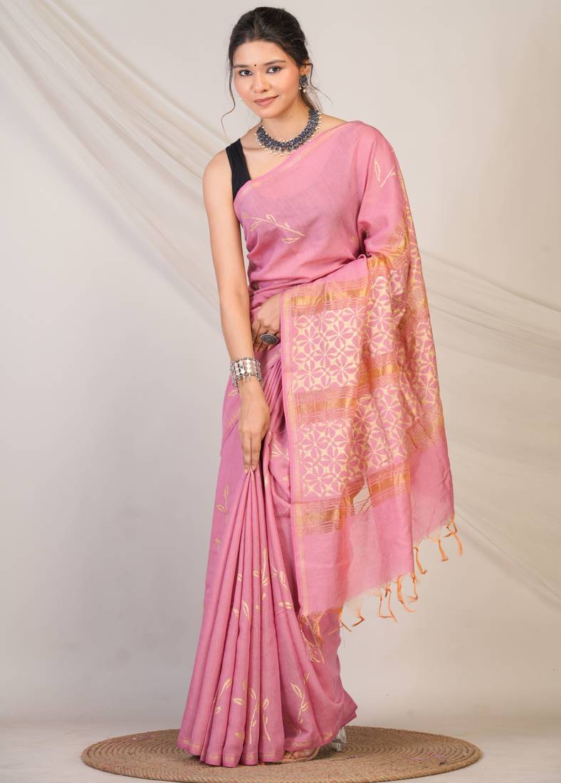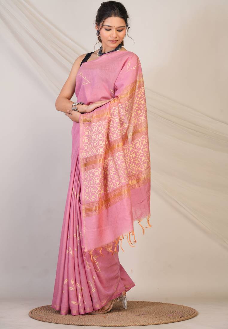 | Product Description | Step Into A World Of Vibrant Tradition With This Stunning Pink Bhagalpuri Saree, Crafted From Soft & Breathable Cotton Fine Fabric For Ultimate Comfort And Grace. This Saree Beautifully Blends Classic Artistry With Festive Charm, Featuring Delicate Hand Block Prints Enhanced By Shimmering Golden Foil Accents That Add A Subtle Glow To The Rich Pink Canvas.The Soft Pink Hue Radiates Warmth & Femininity, Perfectly Highlighted By A Slender Golden Zari Border That Sparkles With Understated Elegance. |
