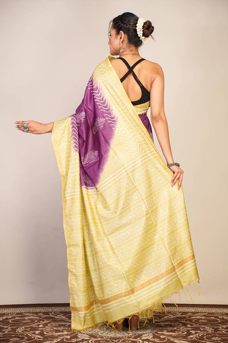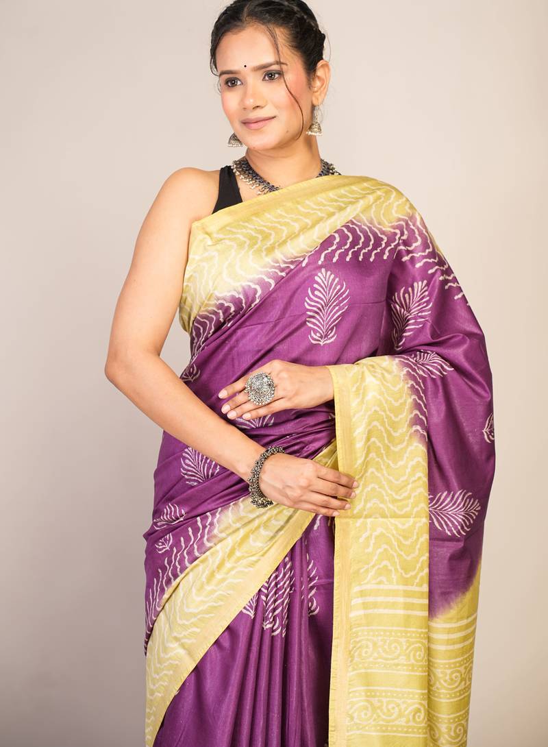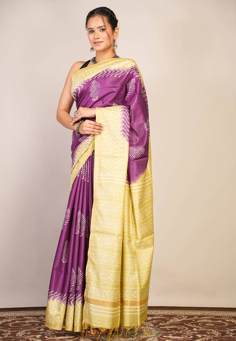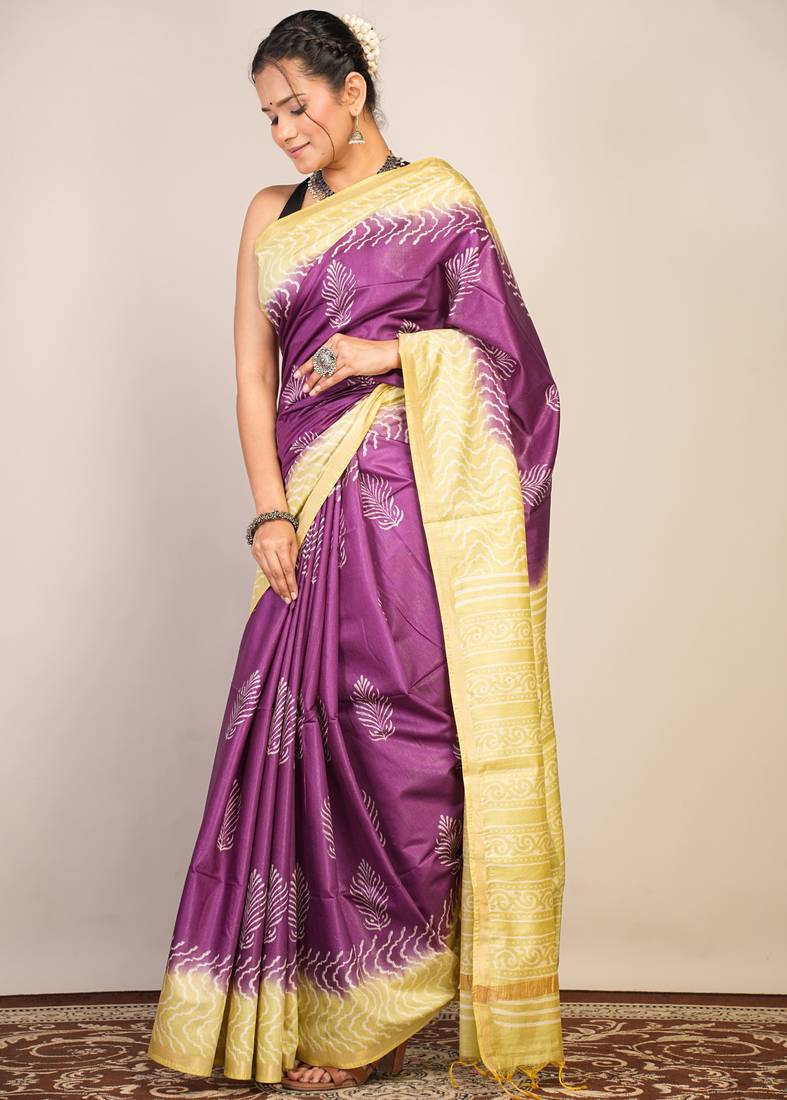 Experience The Perfect Blend Of Tradition And Modern Artistry With This Stunning Purple & Green Bhagalpuri Cotton Silk Saree. Crafted From Premium Cotton Silk, This Saree Promises Lightweight Comfort Paired With A Luxurious Sheen, Making It An Ideal Choice For Weddings, Festive Occasions, And Special Celebrations.
