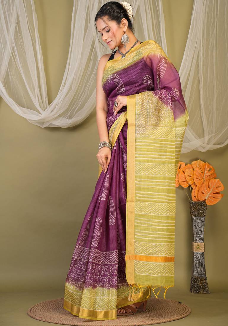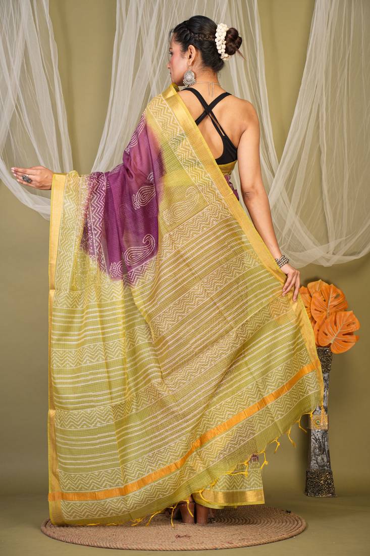 Purple & green zari work kota doria kota doria ethnic saree with unstitched blouse