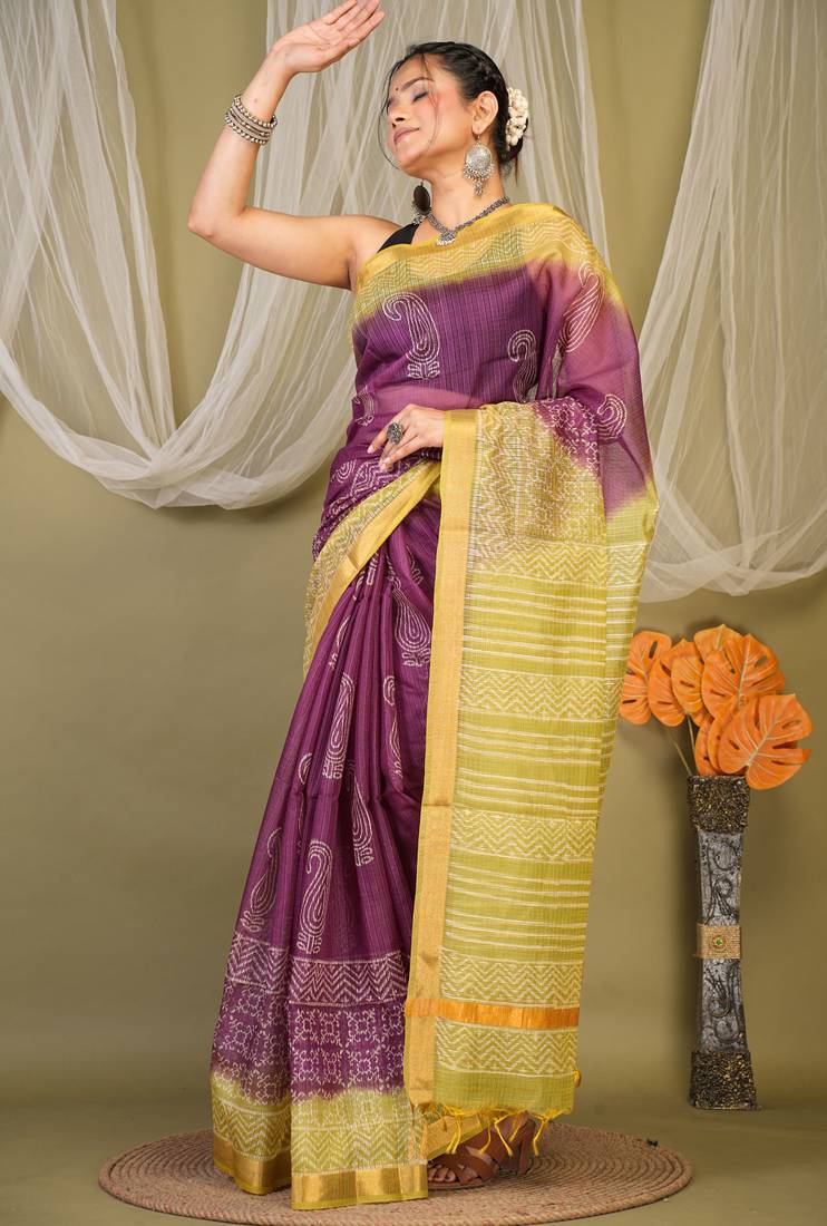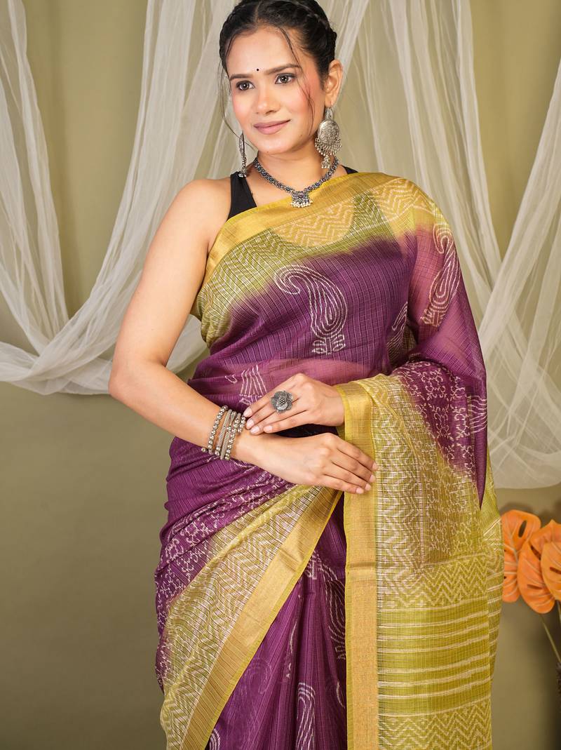 | Product Description | Bring A Splash Of Heritage To Your Wardrobe With This Elegant Purple/Green Kota Doria Ethnic Saree, Crafted From Lightweight, Breathable Fabric. Adorned With Unique Hand Block Paisley Patterns And Thick Golden Border, This Saree Is Perfect For Weddings, Festivals, And Special Occasions. Comes With Coordinating Blouse That Completes Your Overall Look. Style It Traditionally With Oxidized Silver Jewelry Or Keep It Chic With Minimal Accessories — This Saree Lets You Shine Your Way. |