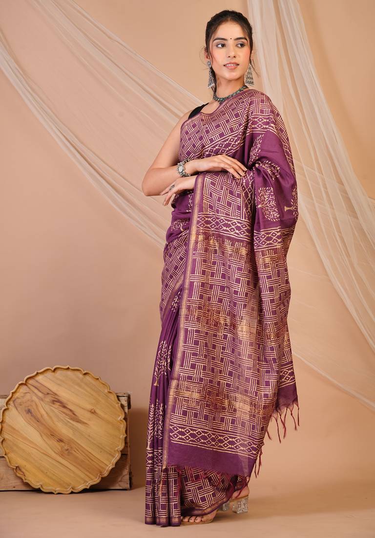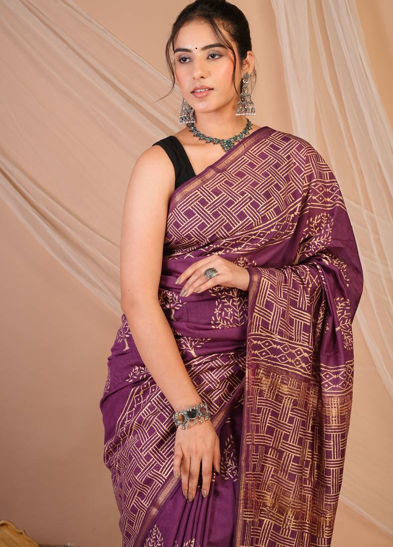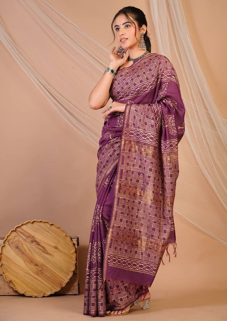 | Product Description | Celebrate Tradition With A Contemporary Touch In This Elegant Purple Bhagalpuri Saree, Crafted From Luxuriously Soft And Breathable Cotton Fine Fabric. The Saree Showcases Intricate Hand Block Prints, Enhanced With Delicate Golden Foil Detailing That Adds A Gentle Shimmer Across The Rich Purple Colored Fabric. |