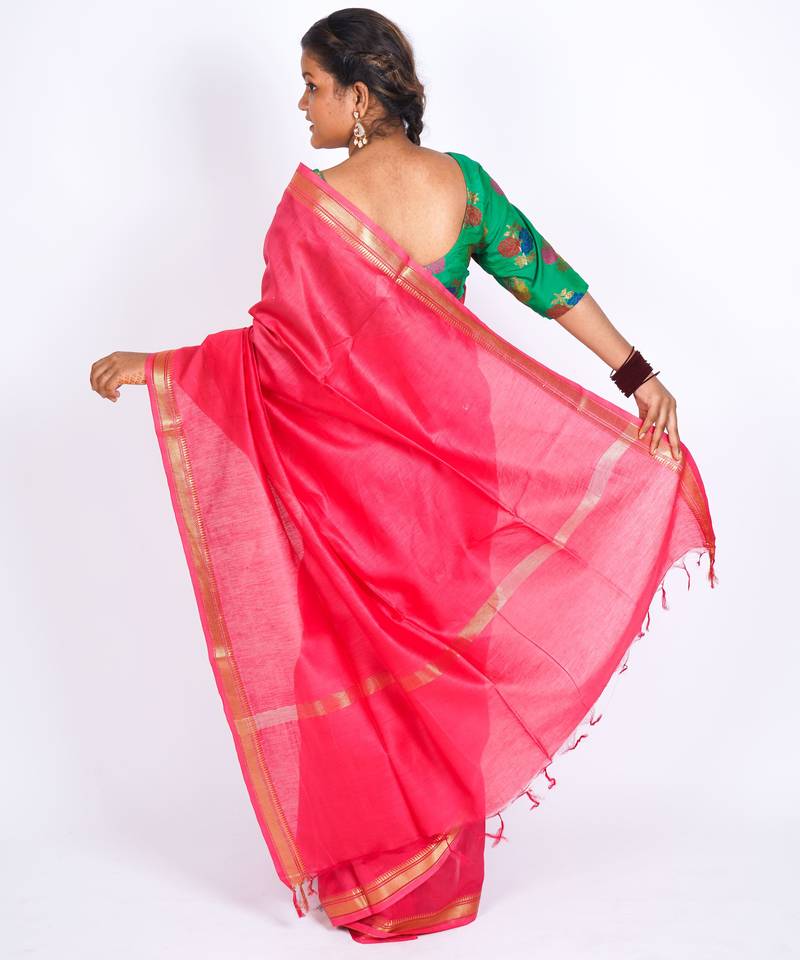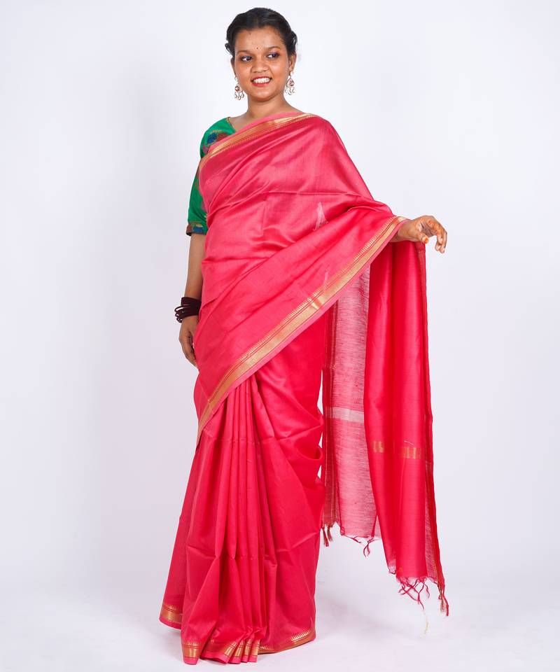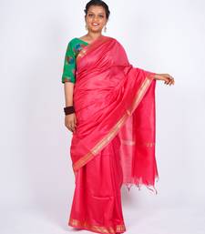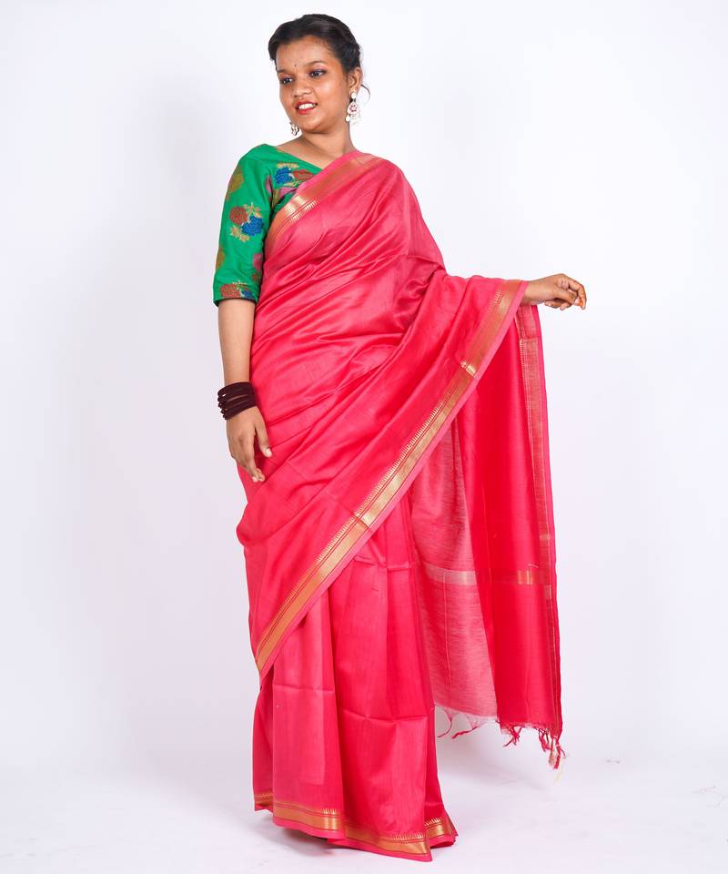 Rani pink gold zari, maheshwari work tusser silk blend bhagalpuri ethnic saree with unstitched blouse